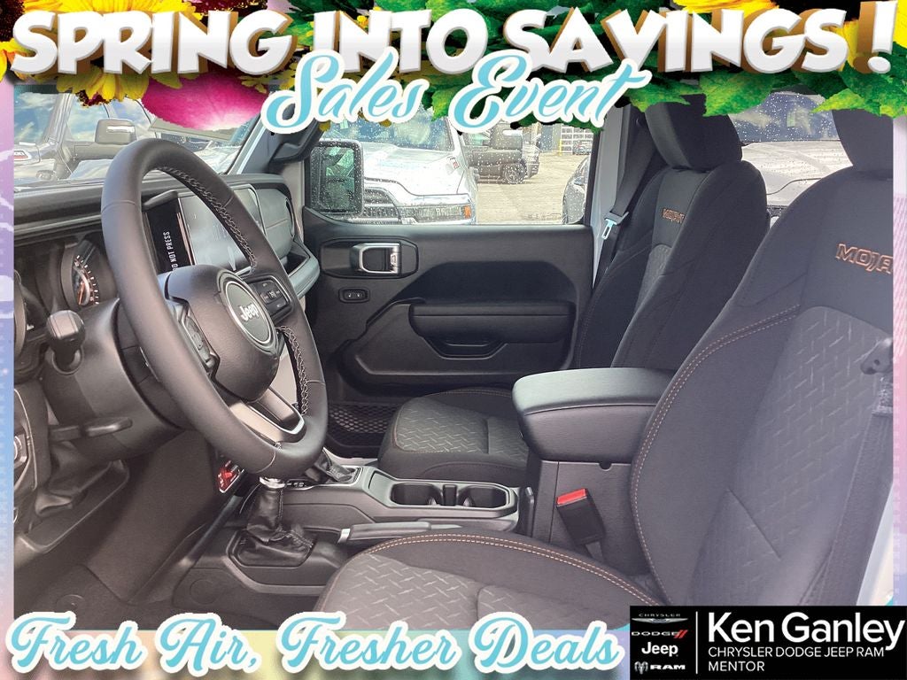 110 Mph Vehicle Max Speed Calibration, 12.3 Touchscreen Display, 4-Wheel Disc Brakes, 4.10 Rear Axle Ratio, 4G LTE Wi-Fi Hot Spot, 8 Speakers, ABS brakes, Air Conditioning, Alexa Built-in, Alloy wheels, AM/FM radio: SiriusXM with 360L, Apple CarPlay, Apple CarPlay/Android Auto, Automatic temperature control, Body Color 3-Piece Hard Top, Body Color Rubicon Highline Flare, Brake assist, Compass, Connectivity - US/Canada, Convenience Group, Delay-off headlights, Driver door bin, Driver vanity mirror, Dual front impact airbags, Dual front side impact airbags, Electronic Stability Control, Emergency communication system: Jeep Connect, For Details, Visit DriveUconnect.com, Freedom Panel Storage Bag, Front anti-roll bar, Front Bucket Seats, Front Center Armrest w/Storage, Front dual zone A/C, Front fog lights, Front License Plate Bracket, Front reading lights, Fully automatic headlights, Google Android Auto, Heated door mirrors, Heated Front Seats, Heated Steering Wheel, Heavy Duty Suspension with Gas Shocks, Illuminated entry, Integrated Center Stack Radio, Integrated roll-over protection, Low tire pressure warning, Manufacturer's Statement of Origin, MOPAR All-Weather Slush Mats, MOPAR Spray in Bedliner, MyFlexCare Service Plan, Occupant sensing airbag, Outside temperature display, Overhead airbag, Panic alarm, Passenger door bin, Passenger vanity mirror, Power door mirrors, Power steering, Power windows, Premium Cloth Seats with Sport Bolsters, Quick Order Package 24D Mojave, Radio data system, Radio: Uconnect 5 with 12.3 Display, Rear anti-roll bar, Rear reading lights, Rear Sliding Window, Rear Window Defroster, Remote keyless entry, Remote Start System, Security system, SiriusXM Radio Service, SiriusXM with 360L, Speed control, Split folding rear seat, Steering wheel mounted audio controls, Tachometer, Telescoping steering wheel, Tilt steering wheel, Traction control, Trip computer, Universal Garage Door Opener, USB Host Flip, Variably intermittent wipers, Voltmeter, Wheels: 17 x 7.5 Dark Gray Painted. PRICING AVAILABLE TO ALL CUSTOMER!!! WE ARE ONE OF OHIO'S LEADING VOLUME DEALERSHIPS COME SEE OUR HUGE SELECTION AND UNMATCHED SAVINGS ONLY AT GANLEY VILLAGE CHRYSLER DODGE JEEP RAM FIAT OF PAINESVILLE, OH 44077.