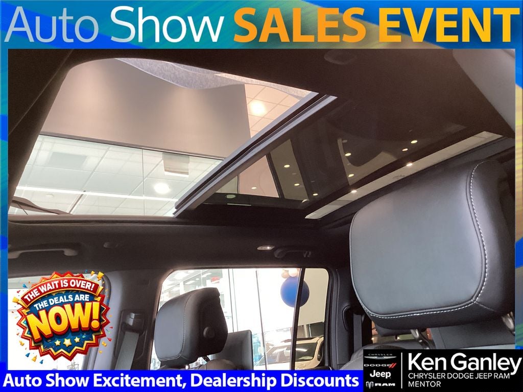 *Heated steering wheel, *Ventilated front seats, 118 Mph Maximum Speed Calibration, 19 Speaker McIntosh Audio System, 3 Panel Sunroof, 3.55 Rear Axle Ratio, 3rd row seats: bench, 4-Wheel Disc Brakes, 9 Speakers, ABS brakes, Air Conditioning, All-Season Floor Mats, Alloy wheels, Altitude Appearance Package, AM/FM radio: SiriusXM with 360L, Amazon Fire TV Built-in, Anti-whiplash front head restraints, Apple CarPlay/Android Auto, Audio memory, Auto Adjust in Reverse Exterior Mirrors, Auto High-beam Headlights, Auto-dimming door mirrors, Auto-Dimming Exterior Driver Mirror, Auto-dimming Rear-View mirror, Auto-leveling suspension, Automatic temperature control, Black Exterior Accents, Brake assist, Bumpers: body-color, Cargo Cover, Cargo Tray, Compass, Delay-off headlights, Driver door bin, Driver vanity mirror, Driver's Seat Mounted Armrest, Dual front impact airbags, Dual front side impact airbags, Electronic Stability Control, Emergency communication system: Jeep Connect, Exterior Mirrors Approach Lamps, Exterior Mirrors with Memory, Exterior Mirrors with Supplemental Signals, Exterior Parking Camera Rear, Four wheel independent suspension, Front anti-roll bar, Front Bucket Seats, Front Center Armrest w/Storage, Front dual zone A/C, Front fog lights, Front reading lights, Fully automatic headlights, Garage door transmitter, Heated door mirrors, Heated Exterior Mirrors, Heated front seats, Heated rear seats, Illuminated entry, Interior Rear Facing Camera, Knee airbag, Leather Trimmed Bucket Seats, Low tire pressure warning, Luxury Front and Rear Floor Mats, Memory seat, MOPAR Interior Protection Package, MyFlexCare Service Plan, Navigation System, Normal Duty Suspension, Occupant sensing airbag, Outside temperature display, Overhead airbag, Overhead console, Panic alarm, Passenger door bin, Passenger seat mounted armrest, Passenger vanity mirror, Power Deployable Running Boards, Power door mirrors, Power driver seat, Power Liftgate, Power passenger seat, Power steering, Power windows, Premium Group II, Quick Order Package 29X Altitude, Radio data system, Radio: Uconnect 5 Nav with 12.0 Display, Rain sensing wipers, Rear air conditioning, Rear anti-roll bar, Rear reading lights, Rear seat center armrest, Rear Seat Video Group I, Rear window defroster, Rear window wiper, Reclining 3rd row seat, Remote keyless entry, Reversible Carpet/Vinyl Cargo Mat, Seatback Video Screens, Security system, Speed control, Speed-sensing steering, Speed-Sensitive Wipers, Split folding rear seat, Steering wheel memory, Steering wheel mounted audio controls, Tachometer, Telescoping steering wheel, Tilt steering wheel, Titanium Daylight Opening Upper, Titanium Upper Grille Applique, Traction control, Trip computer, Turn signal indicator mirrors, Variably intermittent wipers, Ventilated rear seats, Video USB Port, Voltmeter, Wheels: 20 x 9 Aluminum Painted, Wheels: 22 x 9 Painted Gloss Black. PRICING AVAILABLE TO ALL CUSTOMER!!! WE ARE ONE OF OHIO'S LEADING VOLUME DEALERSHIPS COME SEE OUR HUGE SELECTION AND UNMATCHED SAVINGS ONLY AT GANLEY VILLAGE CHRYSLER DODGE JEEP RAM FIAT OF PAINESVILLE, OH 44077.