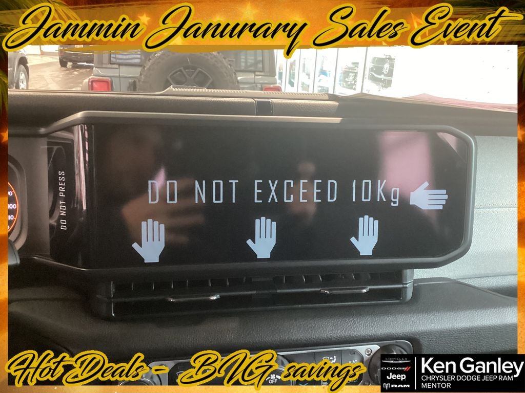 *ParkView Rear Back-Up Camera, 12.3 Touchscreen Display, 2-Door Passive Entry, Front Door Locks, 4-Wheel Disc Brakes, 4-Wheel Drive Swing Gate Decal, 4G LTE Wi-Fi Hot Spot, 7 and 4 Pin Wiring Harness, 8 Speakers, ABS brakes, Advanced Brake Assist, Air Conditioning, Air Conditioning with Auto Temp Control, Air Filtering, AM/FM radio: SiriusXM with 360L, Apple CarPlay, Apple CarPlay/Android Auto, Automatic Headlamps, Aux Battery, Auxiliary Switches, Black Grille with Gloss Black Rings, Brake assist, Class II Receiver Hitch, Cloth Low-Back Bucket Seats, Cluster 7.0 TFT Color Display, Compass, Connectivity - US/Canada, Convenience Group, Conventional Differential Front Axle, Corning Gorilla Glass, Dana M210 Wide HD Tube Front Axle, Dana M220 Wide Rear Axle, Daytime Running Lamps LED Accents, Deep Tint Sunscreen Windows, Delay-off headlights, Driver door bin, Driver vanity mirror, Dual front impact airbags, Dual front side impact airbags, E-Locker Rear Axle, Electronic Stability Control, Emergency/Assistance Call, Enhanced Adaptive Cruise Control, For More Info, Call 800-643-2112, Front anti-roll bar, Front Bucket Seats, Front Center Armrest w/Storage, Front fog lights, Front LED Fog Lamps, Front reading lights, Full Speed Forward Collision Warning Plus, Google Android Auto, Heated Front Seats, Heated Steering Wheel, Illuminated entry, Injection Molded Black Rear Bumper, Integrated Center Stack Radio, Integrated roll-over protection, LED Premium Reflector Headlamps, Low tire pressure warning, Mold in Color Bumper with Gloss Black, Molded in Color Rubicon Highline Flare, MOPAR All-Weather Floor Mats, Myflexcare Service Plan, Non-Lock Fuel Cap Without Discriminator, Normal Duty Suspension, Occupant sensing airbag, Off-Road Plus Mode, Outside temperature display, Overhead airbag, Panic alarm, Passenger door bin, Passenger vanity mirror, Power Dome Dual Vented Hood, Power Heated Mirrors, Power steering, Power windows, Premium Wrapped Steering Wheel, Quick Order Package 22W Willys, Radio data system, Radio: Uconnect 5 with 12.3 Display, Rear anti-roll bar, Rear reading lights, Remote keyless entry, Security Alarm, SiriusXM Radio Service, SiriusXM with 360L, Speed control, Steel Power Dome Hood Package, Steering wheel mounted audio controls, Stop-Start Dual Battery System, Sun Visors with Illuminated Vanity Mirrors, Tachometer, Telescoping steering wheel, Tilt steering wheel, Traction control, Trip computer, Universal Garage Door Opener, Variably intermittent wipers, Wheels: 17 x 7.5 Black Steel Styled, Wheels: 17 x 7.5 Painted Black, Willy's Suspension, Willys Hood Decal. PRICING AVAILABLE TO ALL CUSTOMER!!! WE ARE ONE OF OHIO'S LEADING VOLUME DEALERSHIPS COME SEE OUR HUGE SELECTION AND UNMATCHED SAVINGS ONLY AT GANLEY VILLAGE CHRYSLER DODGE JEEP RAM FIAT OF PAINESVILLE, OH 44077.