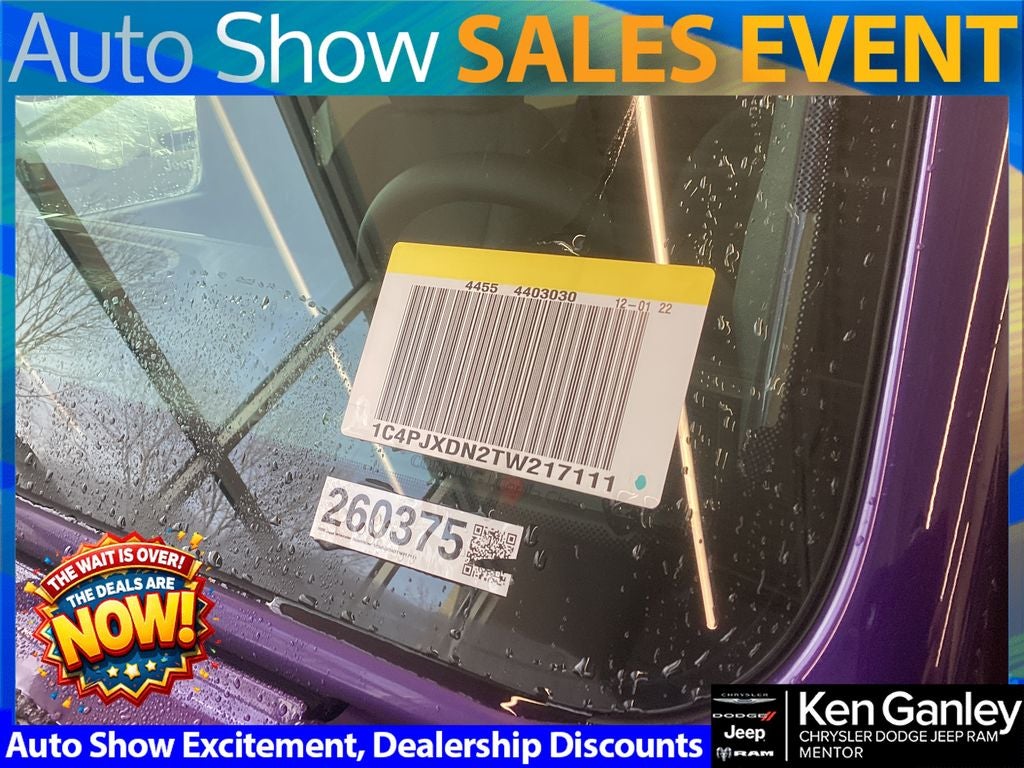 *ParkView Rear Back-Up Camera, 12.3 Touchscreen Display, 2-Door Passive Entry, Front Door Locks, 4-Wheel Disc Brakes, 4-Wheel Drive Swing Gate Decal, 4G LTE Wi-Fi Hot Spot, 7 and 4 Pin Wiring Harness, 8 Speakers, ABS brakes, Advanced Brake Assist, Air Conditioning, Air Conditioning with Auto Temp Control, Air Filtering, AM/FM radio: SiriusXM with 360L, Apple CarPlay, Apple CarPlay/Android Auto, Automatic Headlamps, Aux Battery, Auxiliary Switches, Black Grille with Gloss Black Rings, Brake assist, Class II Receiver Hitch, Cluster 7.0 TFT Color Display, Compass, Connectivity - US/Canada, Convenience Group, Conventional Differential Front Axle, Corning Gorilla Glass, Dana M210 Wide HD Tube Front Axle, Dana M220 Wide Rear Axle, Daytime Running Lamps LED Accents, Deep Tint Sunscreen Windows, Delay-off headlights, Driver door bin, Driver vanity mirror, Dual front impact airbags, Dual front side impact airbags, E-Locker Rear Axle, Electronic Stability Control, Emergency/Assistance Call, Enhanced Adaptive Cruise Control, For More Info, Call 800-643-2112, Front anti-roll bar, Front Bucket Seats, Front Center Armrest w/Storage, Front fog lights, Front LED Fog Lamps, Front reading lights, Full Speed Forward Collision Warning Plus, Google Android Auto, Heated Front Seats, Heated Steering Wheel, Illuminated entry, Injection Molded Black Rear Bumper, Integrated Center Stack Radio, Integrated roll-over protection, LED Premium Reflector Headlamps, Low tire pressure warning, Mold in Color Bumper with Gloss Black, Molded in Color Rubicon Highline Flare, MOPAR All-Weather Floor Mats, Myflexcare Service Plan, Non-Lock Fuel Cap Without Discriminator, Normal Duty Suspension, Occupant sensing airbag, Off-Road Plus Mode, Outside temperature display, Overhead airbag, Panic alarm, Passenger door bin, Passenger vanity mirror, Power Dome Dual Vented Hood, Power Heated Mirrors, Power steering, Power Top Quarter Window Storage Bag, Power windows, Premium Wrapped Steering Wheel, Quick Order Package 22W Willys, Radio data system, Radio: Uconnect 5 with 12.3 Display, Rear anti-roll bar, Rear reading lights, Rear Window Defroster, Rear Window Wiper/Washer, Remote keyless entry, Removable Rear Quarter Windows, Security Alarm, SiriusXM Radio Service, SiriusXM with 360L, Sky One-Touch Power Top, Speed control, Split folding rear seat, Steel Power Dome Hood Package, Steering wheel mounted audio controls, Stop-Start Dual Battery System, Sun Visors with Illuminated Vanity Mirrors, Tachometer, Telescoping steering wheel, Tilt steering wheel, Traction control, Trip computer, Universal Garage Door Opener, Variably intermittent wipers, Wheels: 17 x 7.5 Black Steel Styled, Wheels: 17 x 7.5 Painted Black, Willy's Suspension, Willys Hood Decal. PRICING AVAILABLE TO ALL CUSTOMER!!! WE ARE ONE OF OHIO'S LEADING VOLUME DEALERSHIPS COME SEE OUR HUGE SELECTION AND UNMATCHED SAVINGS ONLY AT GANLEY VILLAGE CHRYSLER DODGE JEEP RAM FIAT OF PAINESVILLE, OH 44077.