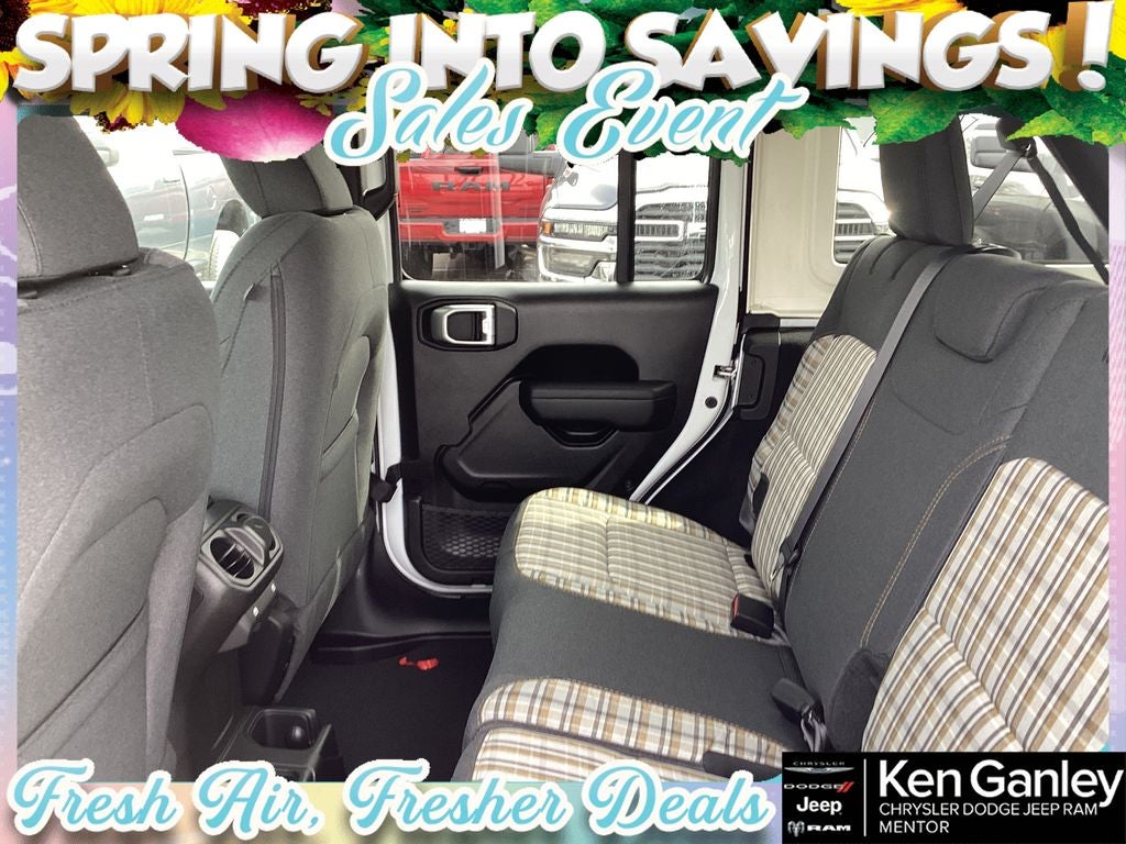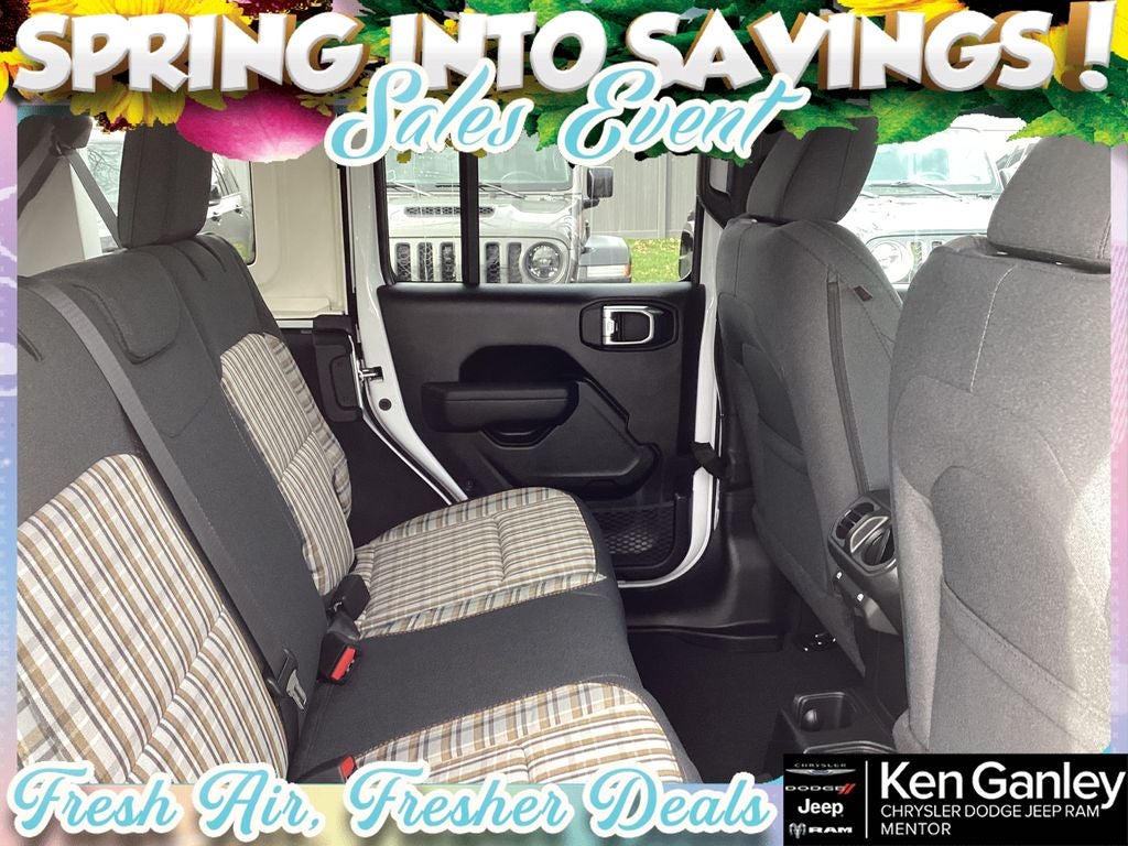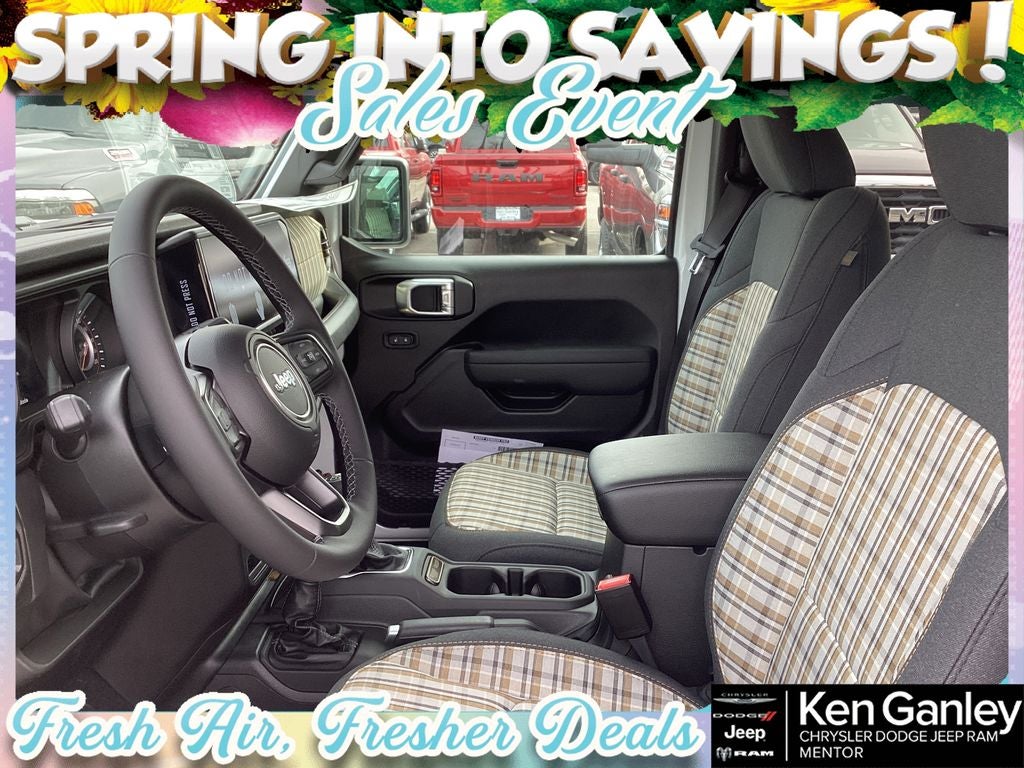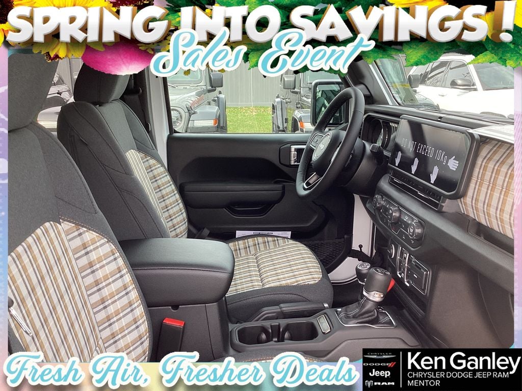 *ParkView Rear Back-Up Camera, 12.3 Touchscreen Display, 2-Door Passive Entry, Front Door Locks, 3.45 Overall Top Gear Ratio, 4-Wheel Disc Brakes, 4G LTE Wi-Fi Hot Spot, 8 Speakers, 85th Anniversary Group, 85th Cupholder Plaque, 85th Fender Decal, 85th Shifter Medallion, 85th Tailgate Decal, 85th Wrangler Hood Decal, ABS brakes, Adaptive Cruise Control with Stop, Advanced Brake Assist, Air Conditioning, Air Conditioning with Auto Temp Control, Air Filtering, Alpine Premium Audio System, AM/FM radio: SiriusXM with 360L, Anti-Lock 4-Wheel Disc Brakes, Apple CarPlay, Apple CarPlay/Android Auto, Automatic Headlamps, Aux Battery, Berber Cargo Mats, Berber Floor Mats, Body Color 3-Piece Hard Top, Body Color Fenders Flares, Brake assist, Bronze Tow Hooks, Central ADAS Decision Module (CADM), Cloth Seat with Plaid Insert and Tag, Cluster 7.0 TFT Color Display, Compass, Connectivity - US/Canada, Corning Gorilla Glass, Daytime Running Lamps LED Accents, Deep Tint Sunscreen Windows, Delay-off headlights, Driver door bin, Driver vanity mirror, Dual front impact airbags, Dual front side impact airbags, Electronic Stability Control, Emergency/Assistance Call, For More Info, Call 800-643-2112, Freedom Panel Storage Bag, Front anti-roll bar, Front Bucket Seats, Front Center Armrest w/Storage, Front fog lights, Front LED Fog Lamps, Front reading lights, Full Speed Forward Collision Warning Plus, Google Android Auto, Gray/Bronze Trail Rated Badge, Heated Front Seats, Heated Steering Wheel, Illuminated entry, Integrated Center Stack Radio, Integrated roll-over protection, LED Premium Reflector Headlamps, Low tire pressure warning, Manufacture Statement of Origin, Mayan Gold Interior Accents, Mopar Black Tubular Side Steps, MOPAR Mesh Sunbonnet Top, MOPAR Stainless Door Sill Guards, Myflexcare Service Plan, No Soft Top, Non-Lock Fuel Cap Without Discriminator, Normal Duty Suspension, Occupant sensing airbag, Outside temperature display, Overhead airbag, Panic alarm, Passenger door bin, Passenger vanity mirror, Plaid Wrap Instrument Panel Mid-Bolster, Power Heated Mirrors, Power steering, Power windows, Premium Wrapped Steering Wheel, Quick Order Package 22F 85th Anniversary Edition, Radio data system, Radio: Uconnect 5 with 12.3 Display, Rear anti-roll bar, Rear reading lights, Rear Window Defroster, Rear Window Wiper/Washer, Remote keyless entry, Security Alarm, SiriusXM Radio Service, SiriusXM with 360L, Speed control, Split folding rear seat, Steering wheel mounted audio controls, Stop-Start Dual Battery System, Sun Visors with Illuminated Vanity Mirrors, Tachometer, Telescoping steering wheel, Tilt steering wheel, Traction control, Trip computer, Universal Garage Door Opener, Variably intermittent wipers, Wheels: 17 x 7.5 Black Steel Styled, Wheels: 17 x 7.5 Steel Oxide. PRICING AVAILABLE TO ALL CUSTOMER!!! WE ARE ONE OF OHIO'S LEADING VOLUME DEALERSHIPS COME SEE OUR HUGE SELECTION AND UNMATCHED SAVINGS ONLY AT GANLEY VILLAGE CHRYSLER DODGE JEEP RAM FIAT OF PAINESVILLE, OH 44077.