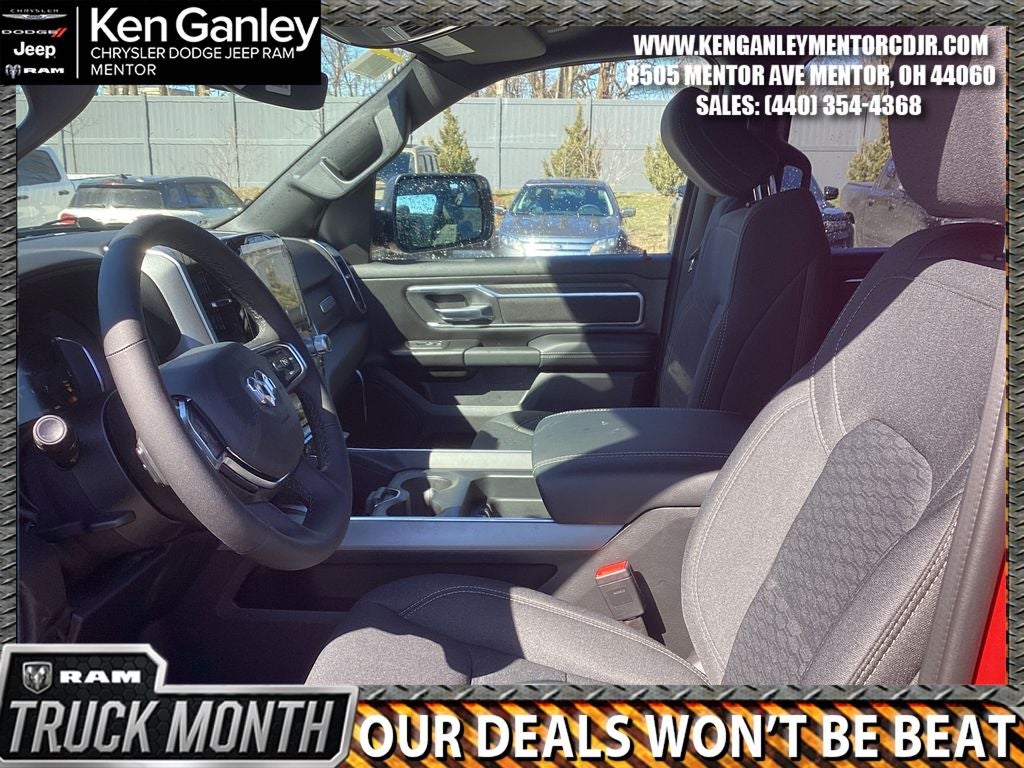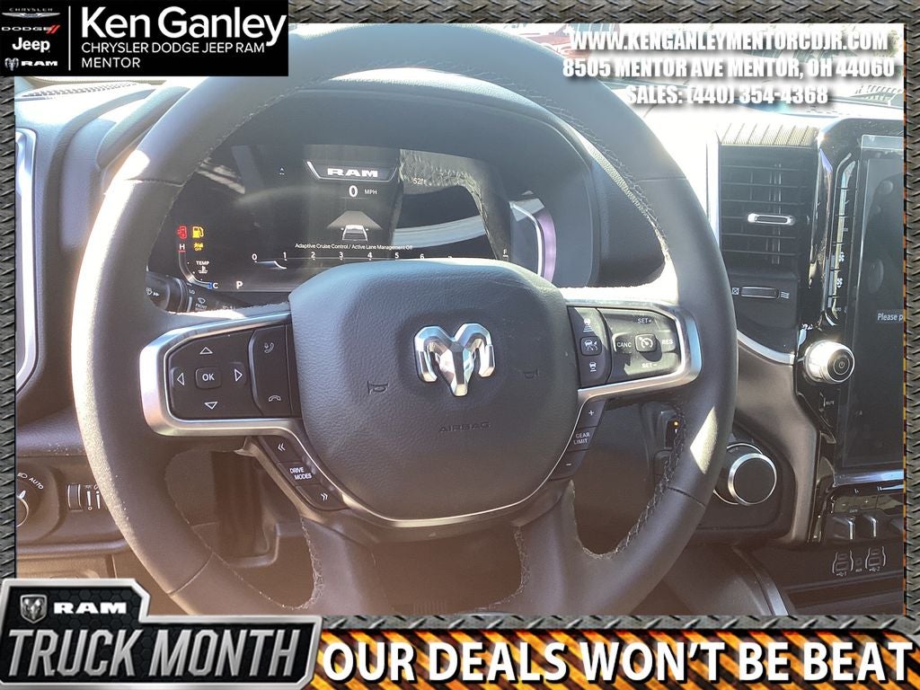 *ParkView Rear Back-Up Camera, 115V Auxiliary Power Outlet, 115V Auxiliary Rear Power Outlet, 12 Touchscreen Display, 2nd Row in Floor Storage Bins, 3 Rear Seat Head Restraints, 4 Way Front Headrests, 4-Wheel Disc Brakes, 400W Inverter, 48V Belt Starter Generator, 4G LTE Wi-Fi Hot Spot, 6 Speakers, 9 Amplified Speakers with Subwoofer, ABS brakes, Accent Color Door Handles, Accent Color Premium Power Mirrors, Accent Color Tailgate Handle, Air Conditioning, Air Conditioning ATC with Dual Zone Control, Alloy wheels, AM/FM radio, Anti-Spin Differential Rear Axle, Apple CarPlay, Apple CarPlay/Android Auto, Auto High-beam Headlights, Auto Power-Folding Mirrors, Auto-Dimming Exterior Driver Mirror, Auto-Dimming Rear-View Mirror, Big Horn Level 2 Equipment Group, Black Exterior Mirrors, Black Exterior Truck Badging, Black Headlamp Bezels, Black Interior Accents, Black Painted Exterior Mirrors Caps, Black Premium Power Mirrors, Black Tail Lamp Bezels, Body Color Fender Flares, Body Color Front Bumper, Body Color Rear Bumper with Step Pads, Brake assist, Bucket Seats, Bumpers: chrome, Center Console Parts Module, Cloth Bucket Seats, Cluster 12 TFT Color Display, Cluster 7.0 TFT Color Display, Compass, Configurable Drive Mode, Connected Travel and Traffic Services, Connectivity - US/Canada, Convex Wide-Angle Exterior Mirror Insert, Delay-off headlights, Deluxe Cloth Bucket Seats, Disassociated Touchscreen Display, Driver door bin, Dual Exhaust with Black Tips, Dual front impact airbags, Dual front side impact airbags, Electronic Stability Control, Exterior Mirrors Courtesy Lamps, Exterior Mirrors with Heating Element, Exterior Mirrors with Supplemental Signals, Front anti-roll bar, Front Bucket Seats, Front Center Armrest w/Storage, Front fog lights, Front License Plate Bracket, Front reading lights, Front Seat Back Map Pockets, Front wheel independent suspension, Full Length Floor Console, Fully automatic headlights, Global Telematics Box Module, Glove Box Lamp, Google Android Auto, GPS Antenna Input, GPS Navigation, Grille Black Surround Black Mesh, HD Radio, Heated door mirrors, Heated Front Seats, Heated Steering Wheel, Illuminated entry, Integrated Center Stack Radio, Integrated Voice Command with Bluetooth®, Leather Wrapped Steering Wheel, LED Dome Lamp with on/Off Switch, LED Footwell Lighting, Low tire pressure warning, Manual Adjust 4-Way Driver Seat, Manual Adjust 4-Way Front Passenger Seat, Manual Folding Exterior Mirrors, Manufacturer's Statement of Origin, Media Hub with 2 Charge Only USBs, MOPAR Front and Rear Rubber Floor Mats, MyFlexCare Service Plan, Night Edition, Occupant sensing airbag, Outside temperature display, Overhead airbag, Overhead console, Overhead LED Lamps, Panic alarm, Passenger door bin, Passenger vanity mirror, Power 2-Way Driver Lumbar Adjust, Power Adjust 8-Way Driver Seat, Power Adjustable Pedals, Power door mirrors, Power steering, Power windows, Premium Overhead Console, Quick Order Package 23Z Big Horn, Radio data system, Radio: Uconnect 5 Navigation with 12.0 Display, Radio: Uconnect 5 W with 8.4 Display, RAM Grille Badge - Black, RAM Grille Badge - Chrome, Rear 60/40 Folding Seat, Rear anti-roll bar, Rear Center Armrest, Rear Power Sliding Window, Rear step bumper, Rear Wheelhouse Liners, Rear Window Defroster, Remote keyless entry, Remote Tailgate Release, Security Alarm, SiriusXM Radio Service, SiriusXM with 360L, Speed control, Steering Wheel Mounted Audio Controls, Sun Visors with Illuminated Vanity Mirrors, Supplier Part Tracking (J-1), Tachometer, Telescoping steering wheel, Tilt steering wheel, Traction control, Trailer Brake Control, Trip computer, Universal Garage Door Opener, USB Host Flip, Variably intermittent wipers, Voltmeter, Wheels: 20 x 9.0 Aluminum Painted Clad. PRICING AVAILABLE TO ALL CUSTOMER!!! WE ARE ONE OF OHIO'S LEADING VOLUME DEALERSHIPS COME SEE OUR HUGE SELECTION AND U Price includes: $3500 - 2026 National Retail Bonus Cash . Exp. 04/30/2026