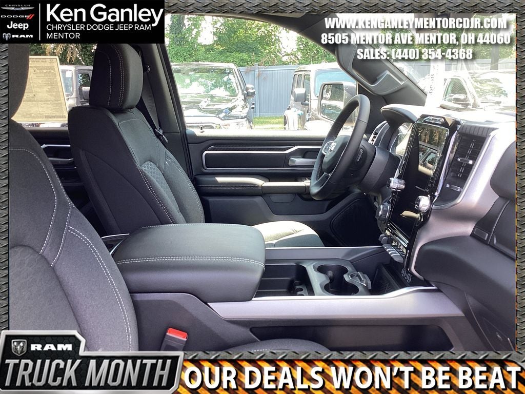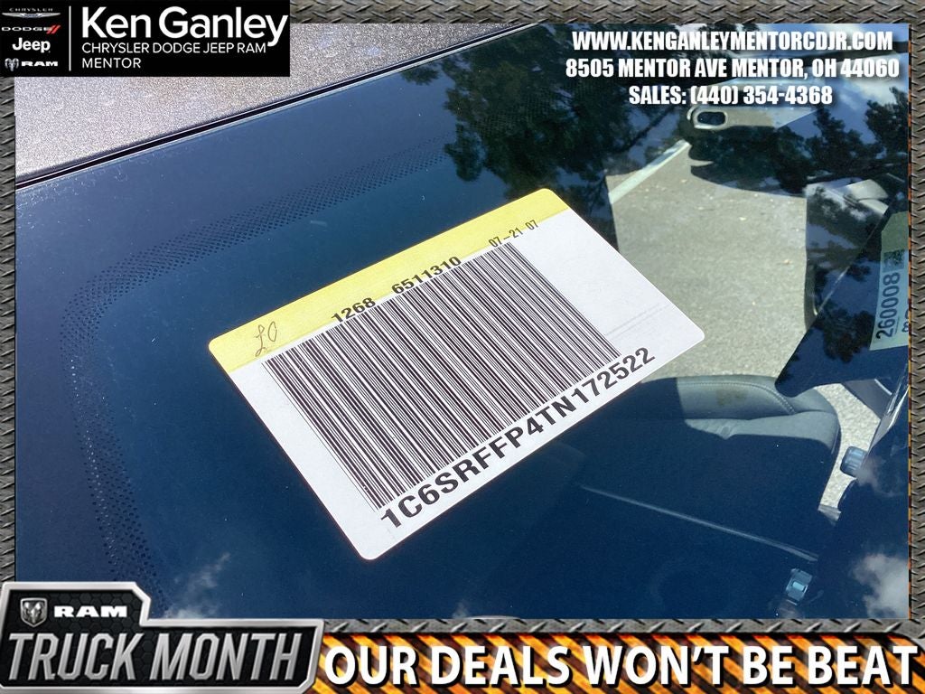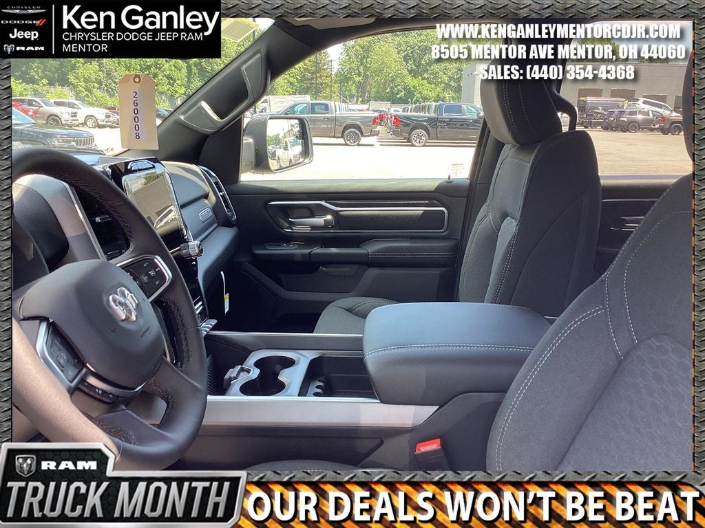 *ParkView Rear Back-Up Camera, 115V Auxiliary Power Outlet, 115V Auxiliary Rear Power Outlet, 12 Touchscreen Display, 2nd Row in Floor Storage Bins, 3 Rear Seat Head Restraints, 4 Way Front Headrests, 4-Wheel Disc Brakes, 400W Inverter, 48V Belt Starter Generator, 4G LTE Wi-Fi Hot Spot, 6 Speakers, 9 Amplified Speakers with Subwoofer, ABS brakes, Accent Color Door Handles, Accent Color Premium Power Mirrors, Accent Color Tailgate Handle, Air Conditioning, Air Conditioning ATC with Dual Zone Control, Alloy wheels, AM/FM radio, Anti-Spin Differential Rear Axle, Apple CarPlay, Apple CarPlay/Android Auto, Auto High-beam Headlights, Auto Power-Folding Mirrors, Auto-Dimming Exterior Driver Mirror, Auto-Dimming Rear-View Mirror, Big Horn Level 2 Equipment Group, Black Exterior Mirrors, Black Exterior Truck Badging, Black Headlamp Bezels, Black Interior Accents, Black Painted Exterior Mirrors Caps, Black Premium Power Mirrors, Black Tail Lamp Bezels, Body Color Fender Flares, Body Color Front Bumper, Body Color Rear Bumper with Step Pads, Brake assist, Bucket Seats, Bumpers: chrome, Center Console Parts Module, Cloth Bucket Seats, Cluster 12 TFT Color Display, Cluster 7.0 TFT Color Display, Compass, Configurable Drive Mode, Connected Travel and Traffic Services, Connectivity - US/Canada, Convex Wide-Angle Exterior Mirror Insert, Delay-off headlights, Deluxe Cloth Bucket Seats, Disassociated Touchscreen Display, Driver door bin, Dual Exhaust with Black Tips, Dual front impact airbags, Dual front side impact airbags, Electronic Stability Control, Exterior Mirrors Courtesy Lamps, Exterior Mirrors with Heating Element, Exterior Mirrors with Supplemental Signals, Front anti-roll bar, Front Bucket Seats, Front Center Armrest w/Storage, Front fog lights, Front License Plate Bracket, Front reading lights, Front Seat Back Map Pockets, Front wheel independent suspension, Full Length Floor Console, Fully automatic headlights, Global Telematics Box Module, Glove Box Lamp, Google Android Auto, GPS Antenna Input, GPS Navigation, Grille Black Surround Black Mesh, HD Radio, Heated door mirrors, Heated Front Seats, Heated Steering Wheel, Illuminated entry, Integrated Center Stack Radio, Integrated Voice Command with Bluetooth®, Leather Wrapped Steering Wheel, LED Dome Lamp with on/Off Switch, LED Footwell Lighting, Low tire pressure warning, Manual Adjust 4-Way Driver Seat, Manual Adjust 4-Way Front Passenger Seat, Manual Folding Exterior Mirrors, Manufacturer's Statement of Origin, Media Hub with 2 Charge Only USBs, MOPAR Front and Rear Rubber Floor Mats, Night Edition, Occupant sensing airbag, Outside temperature display, Overhead airbag, Overhead console, Overhead LED Lamps, Panic alarm, Passenger door bin, Passenger vanity mirror, Power 2-Way Driver Lumbar Adjust, Power Adjust 8-Way Driver Seat, Power Adjustable Pedals, Power door mirrors, Power steering, Power windows, Premium Overhead Console, Quick Order Package 21Z Big Horn, Radio data system, Radio: Uconnect 5 Navigation with 12.0 Display, Radio: Uconnect 5 W with 8.4 Display, RAM Grille Badge - Black, RAM Grille Badge - Chrome, Rear 60/40 Folding Seat, Rear anti-roll bar, Rear Center Armrest, Rear Power Sliding Window, Rear step bumper, Rear Wheelhouse Liners, Rear Window Defroster, Remote keyless entry, Remote Tailgate Release, Security Alarm, SiriusXM Radio Service, SiriusXM with 360L, Speed control, Steering Wheel Mounted Audio Controls, Sun Visors with Illuminated Vanity Mirrors, Supplier Part Tracking (J-1), Tachometer, Telescoping steering wheel, Tilt steering wheel, Traction control, Trailer Brake Control, Trip computer, Universal Garage Door Opener, USB Host Flip, Variably intermittent wipers, Voltmeter, Wheels: 20 x 9.0 Aluminum Painted Cla Price includes: $3500 - 2026 National Retail Consumer Cash . Exp. 03/02/2026 $500 - 2026 Great Lakes BC Cleveland Auto Show Bonus Cash. Exp. 03/02/2026 $500 - 2026 Great Lakes BC Truck Month Bonus Cash . Exp. 03/02/2026