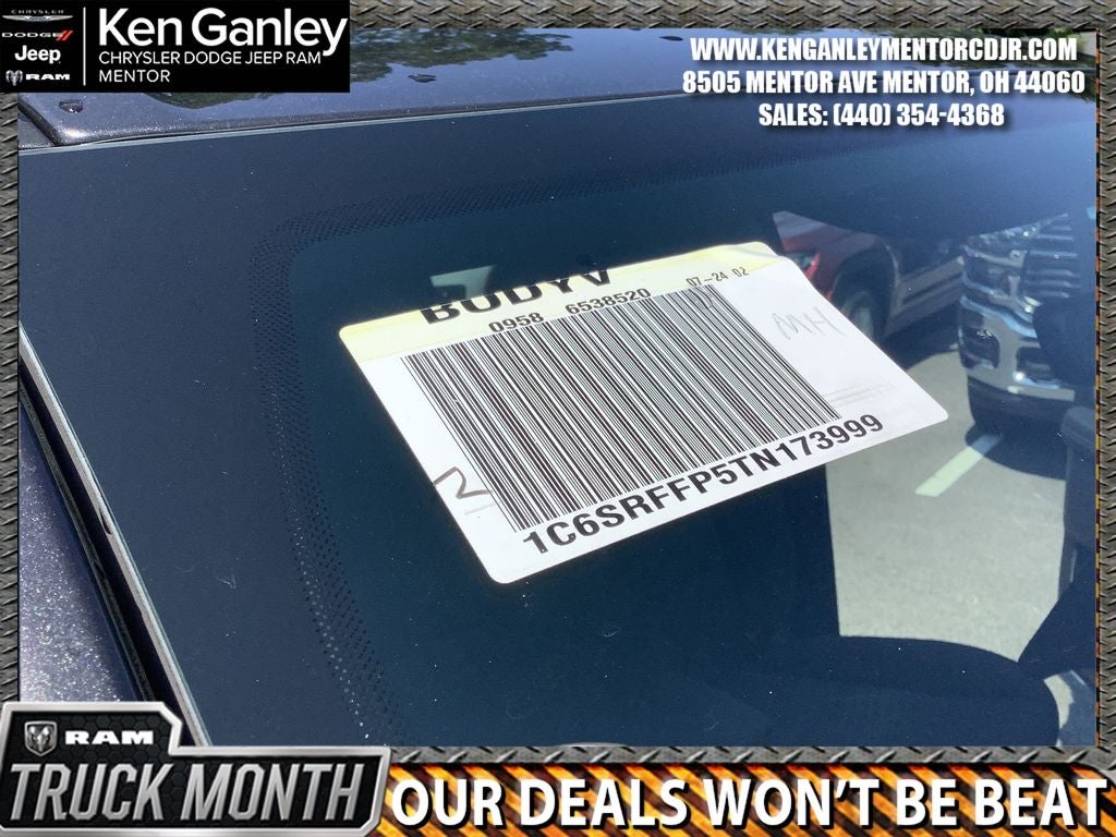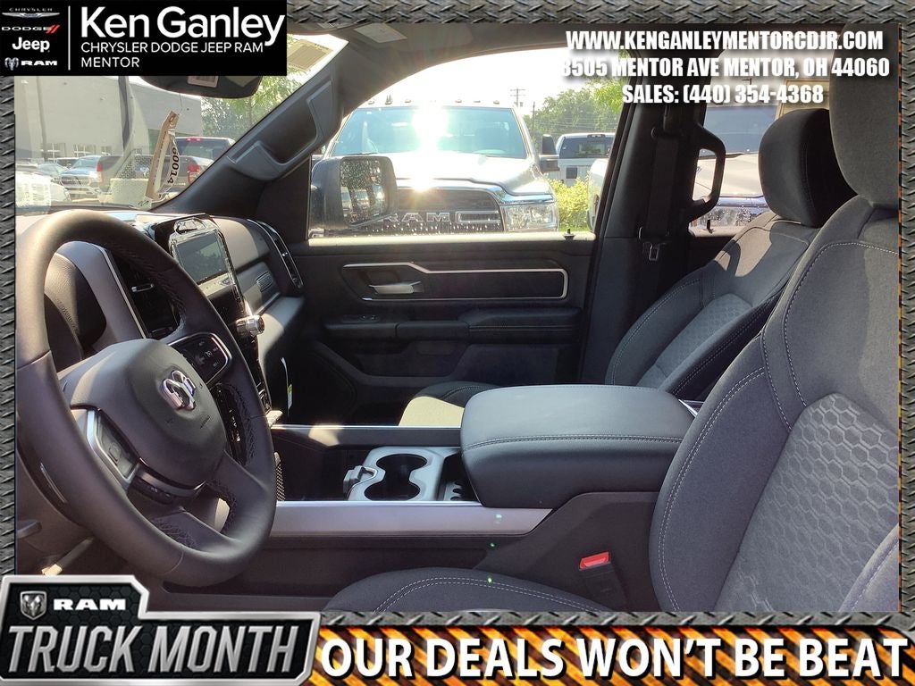 *ParkView Rear Back-Up Camera, 115V Auxiliary Power Outlet, 115V Auxiliary Rear Power Outlet, 12 Touchscreen Display, 2nd Row in Floor Storage Bins, 3 Rear Seat Head Restraints, 4 Way Front Headrests, 4-Wheel Disc Brakes, 400W Inverter, 48V Belt Starter Generator, 4G LTE Wi-Fi Hot Spot, 6 Speakers, 9 Amplified Speakers with Subwoofer, ABS brakes, Accent Color Door Handles, Accent Color Premium Power Mirrors, Accent Color Tailgate Handle, Air Conditioning, Air Conditioning ATC with Dual Zone Control, Alloy wheels, AM/FM radio, Anti-Spin Differential Rear Axle, Apple CarPlay, Apple CarPlay/Android Auto, Auto High-beam Headlights, Auto Power-Folding Mirrors, Auto-Dimming Exterior Driver Mirror, Auto-Dimming Rear-View Mirror, Bed Utility Group, Big Horn Level 2 Equipment Group, Black Exterior Mirrors, Black Exterior Truck Badging, Black Headlamp Bezels, Black Interior Accents, Black Painted Exterior Mirrors Caps, Black Premium Power Mirrors, Black Tail Lamp Bezels, Body Color Fender Flares, Body Color Front Bumper, Body Color Rear Bumper with Step Pads, Brake assist, Bucket Seats, Bumpers: chrome, Center Console Parts Module, Cloth Bucket Seats, Cluster 12 TFT Color Display, Cluster 7.0 TFT Color Display, Compass, Configurable Drive Mode, Connected Travel and Traffic Services, Connectivity - US/Canada, Convex Wide-Angle Exterior Mirror Insert, Delay-off headlights, Deluxe Cloth Bucket Seats, Disassociated Touchscreen Display, Driver door bin, Dual Exhaust with Black Tips, Dual front impact airbags, Dual front side impact airbags, Electronic Stability Control, Exterior 115V AC Outlet, Exterior Mirrors Courtesy Lamps, Exterior Mirrors with Heating Element, Exterior Mirrors with Supplemental Signals, Front anti-roll bar, Front Bucket Seats, Front Center Armrest w/Storage, Front fog lights, Front License Plate Bracket, Front reading lights, Front Seat Back Map Pockets, Front wheel independent suspension, Full Length Floor Console, Fully automatic headlights, Global Telematics Box Module, Glove Box Lamp, Google Android Auto, GPS Antenna Input, GPS Navigation, Grille Black Surround Black Mesh, HD Radio, Heated door mirrors, Heated Front Seats, Heated Steering Wheel, Illuminated entry, Integrated Center Stack Radio, Integrated Voice Command with Bluetooth®, Leather Wrapped Steering Wheel, LED Dome Lamp with on/Off Switch, LED Footwell Lighting, Low tire pressure warning, Manual Adjust 4-Way Driver Seat, Manual Adjust 4-Way Front Passenger Seat, Manual Folding Exterior Mirrors, Manufacturer's Statement of Origin, Media Hub with 2 Charge Only USBs, MOPAR 4 Adjustable Cargo Tie-Down Hooks, MOPAR Front and Rear Rubber Floor Mats, MOPAR Spray in Bedliner, Night Edition, Occupant sensing airbag, Outside temperature display, Overhead airbag, Overhead console, Overhead LED Lamps, Panic alarm, Passenger door bin, Passenger vanity mirror, Pick-Up Box Lighting, Power 2-Way Driver Lumbar Adjust, Power Adjust 8-Way Driver Seat, Power Adjustable Pedals, Power door mirrors, Power steering, Power windows, Premium Overhead Console, Quick Order Package 21Z Big Horn, Radio data system, Radio: Uconnect 5 Navigation with 12.0 Display, Radio: Uconnect 5 W with 8.4 Display, RAM Grille Badge - Black, RAM Grille Badge - Chrome, RamBox Cargo Management System, Rear 60/40 Folding Seat, Rear anti-roll bar, Rear Center Armrest, Rear Power Sliding Window, Rear step bumper, Rear Wheelhouse Liners, Rear Window Defroster, Remote keyless entry, Remote Tailgate Release, Security Alarm, SiriusXM Radio Service, SiriusXM with 360L, Speed control, Steering Wheel Mounted Audio Controls, Sun Visors with Illuminated Vanity Mirrors, Supplier Part Tracking (J-1), Tachometer, Telescoping steering wheel, Tilt steering wheel, Traction control, Trailer Brake Control, Trip computer, Universal Garage Door Opener, USB Hos Price includes: $2000 - 2026 National Select Inventory Bonus Cash. Exp. 02/02/2026 $3500 - 2026 National Retail Consumer Cash . Exp. 02/02/2026