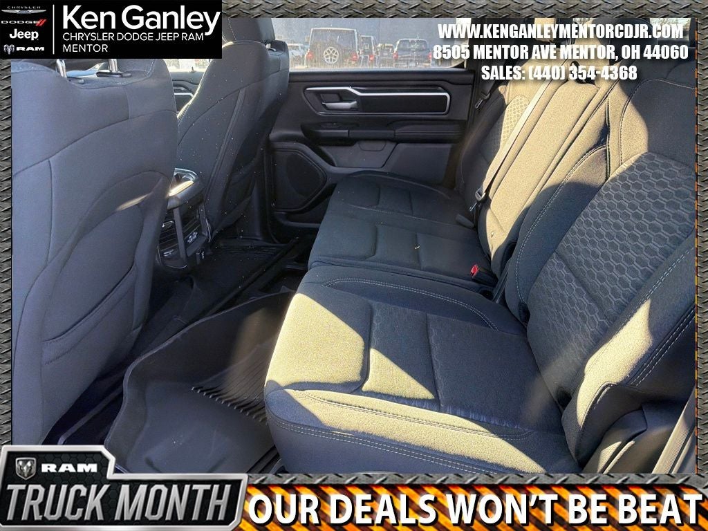 *ParkView Rear Back-Up Camera, 115V Auxiliary Power Outlet, 115V Auxiliary Rear Power Outlet, 12 Touchscreen Display, 2nd Row in Floor Storage Bins, 3 Rear Seat Head Restraints, 33 Gallon Fuel Tank, 4 Way Front Headrests, 4-Wheel Disc Brakes, 400W Inverter, 48V Belt Starter Generator, 4G LTE Wi-Fi Hot Spot, 6 Speakers, 9 Amplified Speakers with Subwoofer, ABS brakes, Accent Color Door Handles, Accent Color Premium Power Mirrors, Accent Color Tailgate Handle, Air Conditioning, Air Conditioning ATC with Dual Zone Control, Alloy wheels, AM/FM radio, Anti-Spin Differential Rear Axle, Apple CarPlay, Apple CarPlay/Android Auto, Auto High-beam Headlights, Auto Power-Folding Mirrors, Auto-Dimming Exterior Driver Mirror, Auto-Dimming Rear-View Mirror, Bed Utility Group, Big Horn Level 2 Equipment Group, Black Exterior Mirrors, Black Exterior Truck Badging, Black Headlamp Bezels, Black Interior Accents, Black Painted Exterior Mirrors Caps, Black Premium Power Mirrors, Black Tail Lamp Bezels, Body Color Fender Flares, Body Color Front Bumper, Body Color Rear Bumper with Step Pads, Brake assist, Bucket Seats, Bumpers: chrome, Center Console Parts Module, Cloth Bucket Seats, Cluster 7.0 TFT Color Display, Compass, Configurable Drive Mode, Connected Travel and Traffic Services, Connectivity - US/Canada, Convex Wide-Angle Exterior Mirror Insert, Delay-off headlights, Deluxe Cloth Bucket Seats, Disassociated Touchscreen Display, Driver door bin, Dual Exhaust with Black Tips, Dual front impact airbags, Dual front side impact airbags, Electronic Stability Control, Exterior 115V AC Outlet, Exterior Mirrors Courtesy Lamps, Exterior Mirrors with Heating Element, Exterior Mirrors with Supplemental Signals, Front anti-roll bar, Front Bucket Seats, Front Center Armrest w/Storage, Front fog lights, Front License Plate Bracket, Front reading lights, Front Seat Back Map Pockets, Front wheel independent suspension, Full Length Floor Console, Fully automatic headlights, Global Telematics Box Module, Glove Box Lamp, Google Android Auto, GPS Antenna Input, GPS Navigation, Grille Black Surround Black Mesh, HD Radio, Heated door mirrors, Heated Front Seats, Heated Steering Wheel, Illuminated entry, Integrated Center Stack Radio, Integrated Voice Command with Bluetooth®, Leather Wrapped Steering Wheel, LED Dome Lamp with on/Off Switch, LED Footwell Lighting, Low tire pressure warning, Manual Adjust 4-Way Driver Seat, Manual Adjust 4-Way Front Passenger Seat, Manual Folding Exterior Mirrors, Media Hub with 2 Charge Only USBs, MOPAR 4 Adjustable Cargo Tie-Down Hooks, Mopar Black Tubular Side Steps, MOPAR Front and Rear Rubber Floor Mats, MOPAR Spray in Bedliner, Night Edition, Occupant sensing airbag, Outside temperature display, Overhead airbag, Overhead console, Overhead LED Lamps, Panic alarm, Passenger door bin, Passenger vanity mirror, Pick-Up Box Lighting, Power 2-Way Driver Lumbar Adjust, Power Adjust 8-Way Driver Seat, Power Adjustable Pedals, Power door mirrors, Power steering, Power windows, Premium Overhead Console, Quick Order Package 27Z Big Horn, Radio data system, Radio: Uconnect 5 Navigation with 12.0 Display, Radio: Uconnect 5 W with 8.4 Display, RAM Grille Badge - Black, RAM Grille Badge - Chrome, RamBox Cargo Management System, Rear 60/40 Folding Seat, Rear anti-roll bar, Rear Center Armrest, Rear Power Sliding Window, Rear step bumper, Rear Window Defroster, Remote keyless entry, Remote Tailgate Release, Security Alarm, SiriusXM Radio Service, SiriusXM with 360L, Speed control, Steering Wheel Mounted Audio Controls, Sun Visors with Illuminated Vanity Mirrors, Supplier Part Tracking (J-1), Tachometer, Telescoping steering wheel, Tilt steering wheel, Traction control, Trailer Brake Control, Trip computer, Universal Garage Door Opener, USB Host Flip, Variably intermittent wipers, Voltmeter, Wheels: 20 x 9.0 Aluminum Painted Clad. P Price includes: $3500 - 2026 National Retail Bonus Cash . Exp. 03/31/2026