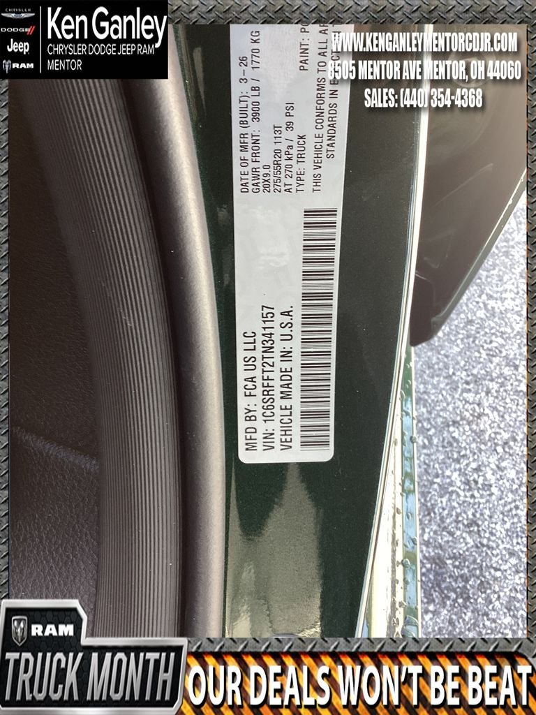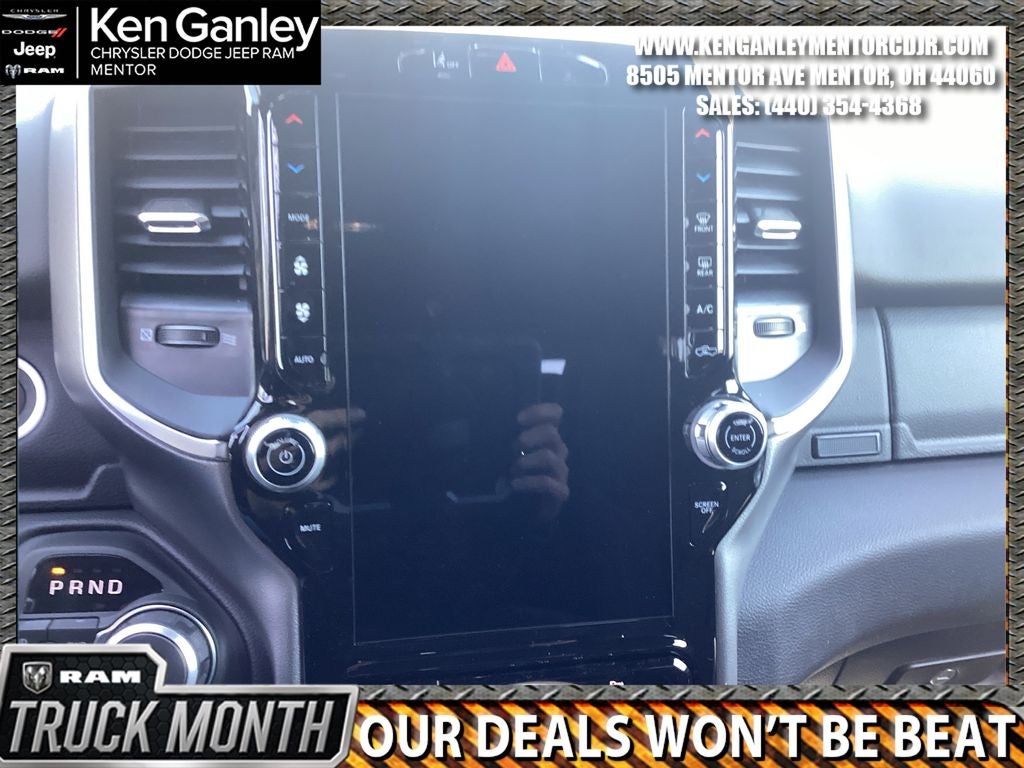 *ParkView Rear Back-Up Camera, 115V Auxiliary Power Outlet, 115V Auxiliary Rear Power Outlet, 12 Touchscreen Display, 2nd Row in Floor Storage Bins, 3 Rear Seat Head Restraints, 4 Way Front Headrests, 4-Wheel Disc Brakes, 400W Inverter, 48V Belt Starter Generator, 4G LTE Wi-Fi Hot Spot, 6 Speakers, 9 Amplified Speakers with Subwoofer, ABS brakes, Accent Color Door Handles, Accent Color Premium Power Mirrors, Accent Color Tailgate Handle, Air Conditioning, Air Conditioning ATC with Dual Zone Control, Alloy wheels, AM/FM radio, Anti-Spin Differential Rear Axle, Apple CarPlay, Apple CarPlay/Android Auto, Auto High-beam Headlights, Auto Power-Folding Mirrors, Auto-Dimming Exterior Driver Mirror, Auto-Dimming Rear-View Mirror, Big Horn Level 2 Equipment Group, Black Exterior Mirrors, Black Exterior Truck Badging, Black Headlamp Bezels, Black Interior Accents, Black Painted Exterior Mirrors Caps, Black Premium Power Mirrors, Black Tail Lamp Bezels, Body Color Fender Flares, Body Color Front Bumper, Body Color Rear Bumper with Step Pads, Brake assist, Bucket Seats, Bumpers: chrome, Center Console Parts Module, Cloth Bucket Seats, Cluster 7.0 TFT Color Display, Compass, Configurable Drive Mode, Connected Travel and Traffic Services, Connectivity - US/Canada, Convex Wide-Angle Exterior Mirror Insert, Delay-off headlights, Deluxe Cloth Bucket Seats, Disassociated Touchscreen Display, Driver door bin, Dual Exhaust with Black Tips, Dual front impact airbags, Dual front side impact airbags, Electronic Stability Control, Exterior Mirrors Courtesy Lamps, Exterior Mirrors with Heating Element, Exterior Mirrors with Supplemental Signals, Front anti-roll bar, Front Bucket Seats, Front Center Armrest w/Storage, Front fog lights, Front License Plate Bracket, Front reading lights, Front Seat Back Map Pockets, Front wheel independent suspension, Full Length Floor Console, Fully automatic headlights, Global Telematics Box Module, Glove Box Lamp, Google Android Auto, GPS Antenna Input, GPS Navigation, Grille Black Surround Black Mesh, HD Radio, Heated door mirrors, Heated Front Seats, Heated Steering Wheel, Illuminated entry, Integrated Center Stack Radio, Integrated Voice Command with Bluetooth®, Leather Wrapped Steering Wheel, LED Dome Lamp with on/Off Switch, LED Footwell Lighting, Low tire pressure warning, Manual Adjust 4-Way Driver Seat, Manual Adjust 4-Way Front Passenger Seat, Manual Folding Exterior Mirrors, Media Hub with 2 Charge Only USBs, MOPAR Front and Rear Rubber Floor Mats, MyFlexCare Service Plan, Night Edition, Occupant sensing airbag, Outside temperature display, Overhead airbag, Overhead console, Overhead LED Lamps, Panic alarm, Passenger door bin, Passenger vanity mirror, Power 2-Way Driver Lumbar Adjust, Power Adjust 8-Way Driver Seat, Power Adjustable Pedals, Power door mirrors, Power steering, Power windows, Premium Overhead Console, Quick Order Package 27Z Big Horn, Radio data system, Radio: Uconnect 5 Navigation with 12.0 Display, Radio: Uconnect 5 W with 8.4 Display, RAM Grille Badge - Black, RAM Grille Badge - Chrome, Rear 60/40 Folding Seat, Rear anti-roll bar, Rear Center Armrest, Rear Power Sliding Window, Rear step bumper, Rear Window Defroster, Remote keyless entry, Remote Tailgate Release, Security Alarm, SiriusXM Radio Service, SiriusXM with 360L, Speed control, Steering Wheel Mounted Audio Controls, Sun Visors with Illuminated Vanity Mirrors, Supplier Part Tracking (J-1), Tachometer, Telescoping steering wheel, Tilt steering wheel, Traction control, Trip computer, Universal Garage Door Opener, USB Host Flip, Variably intermittent wipers, Voltmeter, Wheels: 20 x 9.0 Aluminum Painted Clad. PRICING AVAILABLE TO ALL CUSTOMER!!! WE ARE ONE OF OHIO'S LEADING VOLUME DEALERSHIPS COME SEE OUR HUGE SELECTION AND UNMATCHED SAVINGS ONLY AT GANLEY VILLAGE CHRYSLER DODGE JEEP RAM FIAT OF PAINESVILLE, OH 44077.