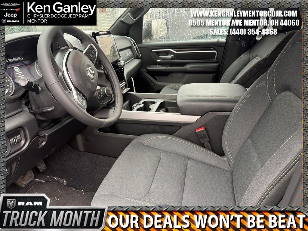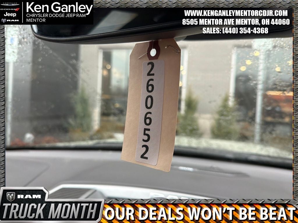 *ParkView Rear Back-Up Camera, 115V Auxiliary Power Outlet, 115V Auxiliary Rear Power Outlet, 12 Touchscreen Display, 2nd Row in Floor Storage Bins, 3 Rear Seat Head Restraints, 4 Way Front Headrests, 4-Wheel Disc Brakes, 400W Inverter, 48V Belt Starter Generator, 4G LTE Wi-Fi Hot Spot, 6 Speakers, 9 Amplified Speakers with Subwoofer, ABS brakes, Air Conditioning, Air Conditioning ATC with Dual Zone Control, Alloy wheels, AM/FM radio, Apple CarPlay, Apple CarPlay/Android Auto, Auto High-beam Headlights, Auto Power-Folding Mirrors, Auto-Dimming Exterior Driver Mirror, Auto-Dimming Rear-View Mirror, Big Horn Level 2 Equipment Group, Black Exterior Mirrors, Black Interior Accents, Black Premium Power Mirrors, Body Color Door Handles, Body Color Fender Flares, Body Color Front Bumper, Body Color Rear Bumper with Step Pads, Body Color Tailgate Handle, Brake assist, Bucket Seats, Bumpers: chrome, Center Console Parts Module, Cloth Bucket Seats, Cluster 7.0 TFT Color Display, Compass, Configurable Drive Mode, Connected Travel and Traffic Services, Connectivity - US/Canada, Convex Wide-Angle Exterior Mirror Insert, Delay-off headlights, Deluxe Cloth Bucket Seats, Disassociated Touchscreen Display, Driver door bin, Dual front impact airbags, Dual front side impact airbags, Electronic Stability Control, Exterior Mirrors Courtesy Lamps, Exterior Mirrors with Heating Element, Exterior Mirrors with Supplemental Signals, Front anti-roll bar, Front Bucket Seats, Front Center Armrest w/Storage, Front fog lights, Front License Plate Bracket, Front reading lights, Front Seat Back Map Pockets, Front wheel independent suspension, Full Length Floor Console, Fully automatic headlights, Global Telematics Box Module, Glove Box Lamp, Google Android Auto, GPS Antenna Input, GPS Navigation, Grille Surround 1 Body Color Texture 1 Black, HD Radio, Heated door mirrors, Heated Front Seats, Heated Steering Wheel, Illuminated entry, Integrated Center Stack Radio, Integrated Voice Command with Bluetooth®, Leather Wrapped Steering Wheel, LED Dome Lamp with on/Off Switch, LED Footwell Lighting, Low tire pressure warning, Manual Adjust 4-Way Driver Seat, Manual Adjust 4-Way Front Passenger Seat, Manual Folding Exterior Mirrors, Manufacturer's Statement of Origin, Media Hub with 2 Charge Only USBs, Occupant sensing airbag, Outside temperature display, Overhead airbag, Overhead console, Overhead LED Lamps, Panic alarm, Passenger door bin, Passenger vanity mirror, Power 2-Way Driver Lumbar Adjust, Power Adjust 8-Way Driver Seat, Power Adjustable Pedals, Power door mirrors, Power steering, Power windows, Premium Overhead Console, Quick Order Package 27Z Big Horn, Radio data system, Radio: Uconnect 5 Navigation with 12.0 Display, Radio: Uconnect 5 W with 8.4 Display, RAM Grille Badge - Chrome, Rear 60/40 Folding Seat, Rear anti-roll bar, Rear Center Armrest, Rear Power Sliding Window, Rear step bumper, Rear Window Defroster, Remote keyless entry, Remote Tailgate Release, Security Alarm, SiriusXM Radio Service, SiriusXM with 360L, Speed control, Sport Appearance Package, Steering Wheel Mounted Audio Controls, Sun Visors with Illuminated Vanity Mirrors, Supplier Part Tracking (J-1), Tachometer, Telescoping steering wheel, Tilt steering wheel, Traction control, Trip computer, Universal Garage Door Opener, USB Host Flip, Variably intermittent wipers, Voltmeter. PRICING AVAILABLE TO ALL CUSTOMER!!! WE ARE ONE OF OHIO'S LEADING VOLUME DEALERSHIPS COME SEE OUR HUGE SELECTION AND UNMATCHED SAVINGS ONLY AT GANLEY VILLAGE CHRYSLER DODGE JEEP RAM FIAT OF PAINESVILLE, OH 44077.