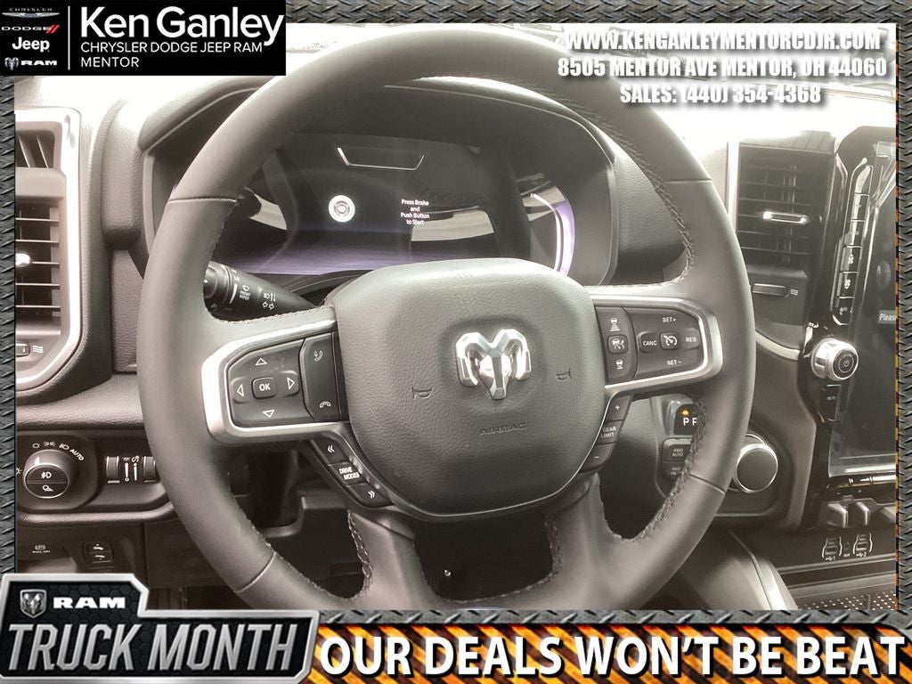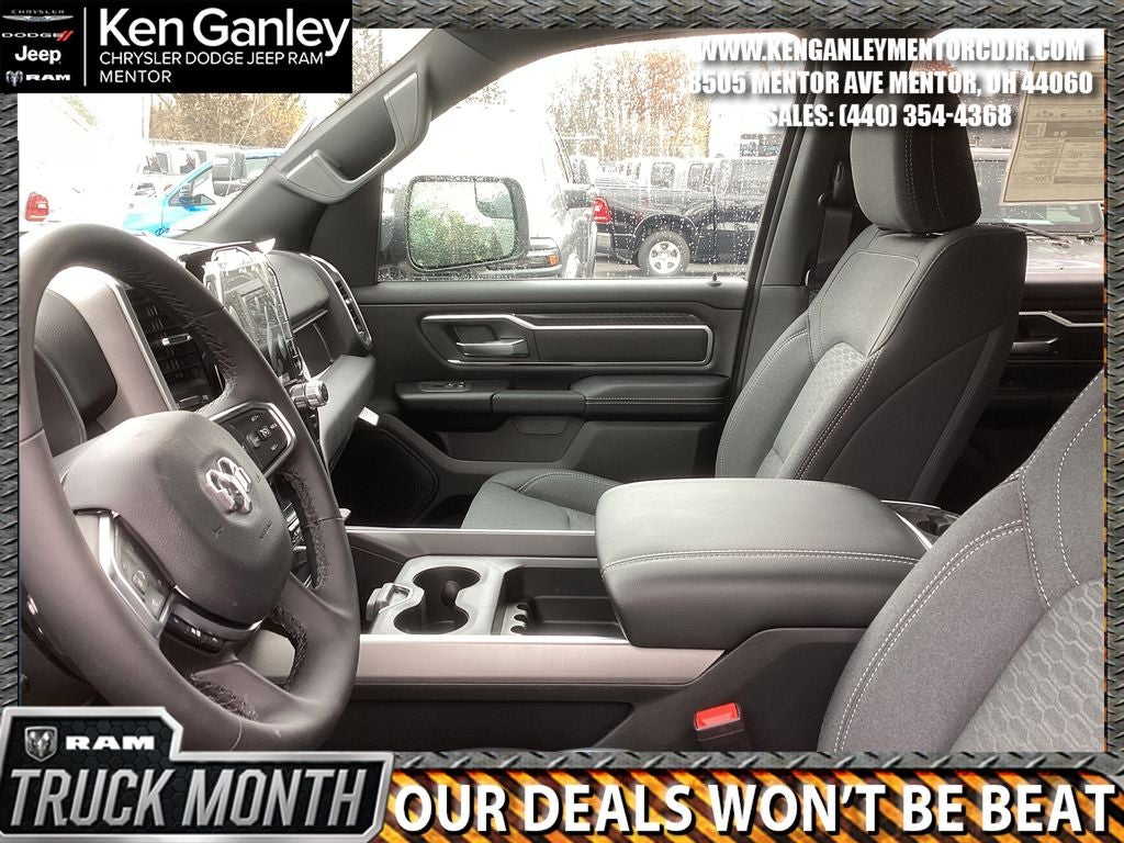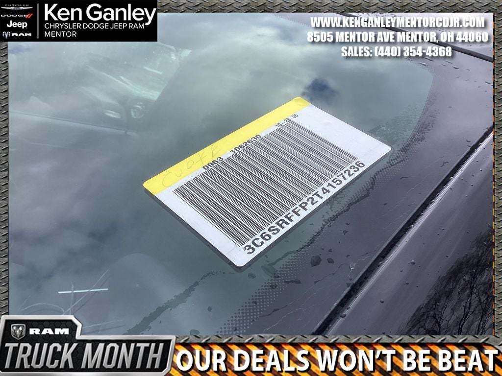 *ParkView Rear Back-Up Camera, 115V Auxiliary Power Outlet, 115V Auxiliary Rear Power Outlet, 12 Touchscreen Display, 2nd Row in Floor Storage Bins, 3 Rear Seat Head Restraints, 4 Way Front Headrests, 4-Wheel Disc Brakes, 400W Inverter, 48V Belt Starter Generator, 4G LTE Wi-Fi Hot Spot, 6 Speakers, 9 Amplified Speakers with Subwoofer, ABS brakes, Accent Color Door Handles, Accent Color Premium Power Mirrors, Accent Color Tailgate Handle, Air Conditioning, Air Conditioning ATC with Dual Zone Control, Alloy wheels, AM/FM radio, Anti-Spin Differential Rear Axle, Apple CarPlay, Apple CarPlay/Android Auto, Auto High-beam Headlights, Auto Power-Folding Mirrors, Auto-Dimming Exterior Driver Mirror, Auto-Dimming Rear-View Mirror, Bed Utility Group, Big Horn Level 2 Equipment Group, Black Exterior Mirrors, Black Exterior Truck Badging, Black Headlamp Bezels, Black Interior Accents, Black Painted Exterior Mirrors Caps, Black Premium Power Mirrors, Black Tail Lamp Bezels, Body Color Fender Flares, Body Color Front Bumper, Body Color Rear Bumper with Step Pads, Brake assist, Bucket Seats, Bumpers: chrome, Center Console Parts Module, Cloth Bucket Seats, Cluster 12 TFT Color Display, Cluster 7.0 TFT Color Display, Compass, Configurable Drive Mode, Connected Travel and Traffic Services, Connectivity - US/Canada, Convex Wide-Angle Exterior Mirror Insert, Delay-off headlights, Deluxe Cloth Bucket Seats, Disassociated Touchscreen Display, Driver door bin, Dual Exhaust with Black Tips, Dual front impact airbags, Dual front side impact airbags, Electronic Stability Control, Exterior 115V AC Outlet, Exterior Mirrors Courtesy Lamps, Exterior Mirrors with Heating Element, Exterior Mirrors with Supplemental Signals, Front anti-roll bar, Front Bucket Seats, Front Center Armrest w/Storage, Front fog lights, Front License Plate Bracket, Front reading lights, Front Seat Back Map Pockets, Front wheel independent suspension, Full Length Floor Console, Fully automatic headlights, Global Telematics Box Module, Glove Box Lamp, Google Android Auto, GPS Antenna Input, GPS Navigation, Grille Black Surround Black Mesh, HD Radio, Heated door mirrors, Heated Front Seats, Heated Steering Wheel, Illuminated entry, Integrated Center Stack Radio, Integrated Voice Command with Bluetooth®, Leather Wrapped Steering Wheel, LED Dome Lamp with on/Off Switch, LED Footwell Lighting, Low tire pressure warning, Manual Adjust 4-Way Driver Seat, Manual Adjust 4-Way Front Passenger Seat, Manual Folding Exterior Mirrors, Manufacturer's Statement of Origin, Media Hub with 2 Charge Only USBs, MOPAR 4 Adjustable Cargo Tie-Down Hooks, MOPAR Front and Rear Rubber Floor Mats, MOPAR Spray in Bedliner, MyFlexCare Service Plan, Night Edition, Occupant sensing airbag, Outside temperature display, Overhead airbag, Overhead console, Overhead LED Lamps, Panic alarm, Passenger door bin, Passenger vanity mirror, Pick-Up Box Lighting, Power 2-Way Driver Lumbar Adjust, Power Adjust 8-Way Driver Seat, Power Adjustable Pedals, Power door mirrors, Power steering, Power windows, Premium Overhead Console, Quick Order Package 21Z Big Horn, Radio data system, Radio: Uconnect 5 Navigation with 12.0 Display, Radio: Uconnect 5 W with 8.4 Display, RAM Grille Badge - Black, RAM Grille Badge - Chrome, RamBox Cargo Management System, Rear 60/40 Folding Seat, Rear anti-roll bar, Rear Center Armrest, Rear Power Sliding Window, Rear step bumper, Rear Wheelhouse Liners, Rear Window Defroster, Remote keyless entry, Remote Tailgate Release, Security Alarm, SiriusXM Radio Service, SiriusXM with 360L, Speed control, Steering Wheel Mounted Audio Controls, Sun Visors with Illuminated Vanity Mirrors, Supplier Part Tracking (J-1), Tachometer, Telescoping steering wheel, Tilt steering Price includes: $3500 - 2026 National Retail Consumer Cash . Exp. 03/02/2026 $500 - 2026 Great Lakes BC Cleveland Auto Show Bonus Cash. Exp. 03/02/2026 $500 - 2026 Great Lakes BC Truck Month Bonus Cash . Exp. 03/02/2026