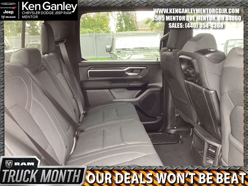 *ParkView Rear Back-Up Camera, 115V Auxiliary Power Outlet, 2nd Row in Floor Storage Bins, 3 Rear Seat Head Restraints, 4 Way Front Headrests, 4-Wheel Disc Brakes, 400W Inverter, 48V Belt Starter Generator, 4G LTE Wi-Fi Hot Spot, 6 Speakers, ABS brakes, Air Conditioning, Alloy wheels, AM/FM radio, Apple CarPlay, Apple CarPlay/Android Auto, Auto High-beam Headlights, Auto Power-Folding Mirrors, Auto-Dimming Exterior Driver Mirror, Auto-Dimming Rear-View Mirror, Big Horn Level 1 Equipment Group, Black Exterior Mirrors, Black Premium Power Mirrors, Body Color Fender Flares, Brake assist, Bucket Seats, Bumpers: chrome, Center Console Parts Module, Cloth Bucket Seats, Compass, Connectivity - US/Canada, Convex Wide-Angle Exterior Mirror Insert, Delay-off headlights, Deluxe Cloth Bucket Seats, Driver door bin, Dual front impact airbags, Dual front side impact airbags, Electronic Stability Control, Exterior Mirrors Courtesy Lamps, Exterior Mirrors with Heating Element, Exterior Mirrors with Supplemental Signals, Front anti-roll bar, Front Bucket Seats, Front Center Armrest w/Storage, Front fog lights, Front License Plate Bracket, Front reading lights, Front Seat Back Map Pockets, Front wheel independent suspension, Full Length Floor Console, Fully automatic headlights, Global Telematics Box Module, Glove Box Lamp, Google Android Auto, GPS Antenna Input, Heated door mirrors, Heated Front Seats, Heated Steering Wheel, Illuminated entry, Integrated Center Stack Radio, Integrated Voice Command with Bluetooth®, Leather Wrapped Steering Wheel, Low tire pressure warning, Manual Adjust 4-Way Driver Seat, Manual Adjust 4-Way Front Passenger Seat, Manual Folding Exterior Mirrors, Manufacturer's Statement of Origin, MOPAR Front and Rear Rubber Floor Mats, MyFlexCare Service Plan, Occupant sensing airbag, Outside temperature display, Overhead airbag, Overhead console, Panic alarm, Passenger door bin, Passenger vanity mirror, Power 2-Way Driver Lumbar Adjust, Power Adjust 8-Way Driver Seat, Power Adjustable Pedals, Power door mirrors, Power steering, Power windows, Quick Order Package 21Z Big Horn, Radio data system, Radio: Uconnect 5 W with 8.4 Display, RAM Grille Badge - Chrome, Rear 60/40 Folding Seat, Rear anti-roll bar, Rear Center Armrest, Rear Dome with on/Off Switch Lamp, Rear Power Sliding Window, Rear step bumper, Rear Wheelhouse Liners, Rear Window Defroster, Remote keyless entry, SiriusXM Radio Service, SiriusXM Satellite Radio, Speed control, Steering Wheel Mounted Audio Controls, Sun Visors with Illuminated Vanity Mirrors, Supplier Part Tracking (J-1), Tachometer, Telescoping steering wheel, Tilt steering wheel, Traction control, Trailer Brake Control, Trip computer, Universal Garage Door Opener, USB Host Flip, Variably intermittent wipers, Voltmeter, Wheels: 18 x 8 Cast-Aluminum Painted. PRICING AVAILABLE TO ALL CUSTOMER!!! WE ARE ONE OF OHIO'S LEADING VOLUME DEALERSHIPS COME SEE OUR HUGE SELECTION AND UNMATCHED SAVINGS ONLY AT GANLEY VILLAGE CHRYSLER DODGE JEEP RAM FIAT OF PAINESVILLE, OH 44077.