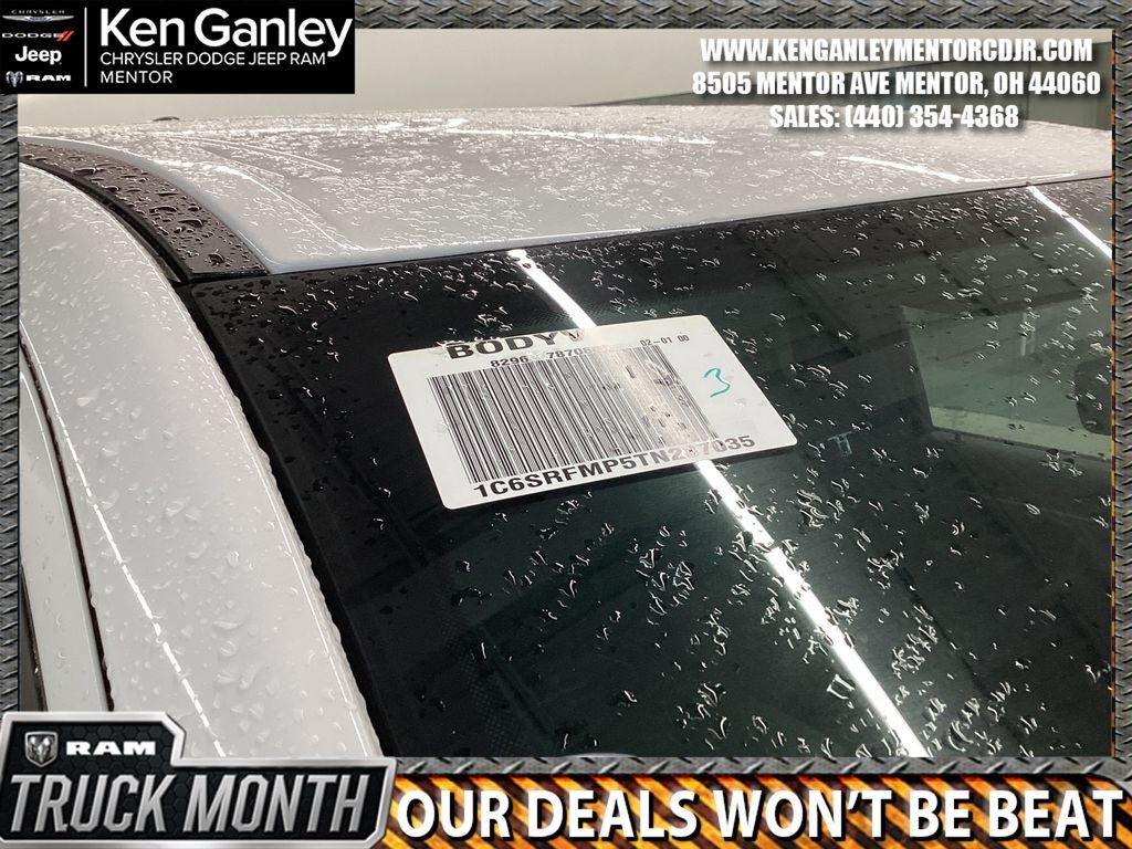 *ParkView Rear Back-Up Camera, 115V Auxiliary Power Outlet, 115V Auxiliary Rear Power Outlet, 12 Touchscreen Display, 2nd Row in Floor Storage Bins, 3 Rear Seat Head Restraints, 4 Way Front Headrests, 4-Wheel Disc Brakes, 400W Inverter, 4G LTE Wi-Fi Hot Spot, 6 Speakers, 9 Amplified Speakers with Subwoofer, ABS brakes, Accent Color Door Handles, Accent Color Premium Power Mirrors, Accent Color Tailgate Handle, Air Conditioning, Air Conditioning ATC with Dual Zone Control, Alloy wheels, AM/FM radio, Anti-Spin Differential Rear Axle, Apple CarPlay, Apple CarPlay/Android Auto, Auto High-beam Headlights, Auto Power-Folding Mirrors, Auto-Dimming Exterior Driver Mirror, Auto-Dimming Rear-View Mirror, Bed Utility Group, Big Horn Level 2 Equipment Group, Black Exterior Mirrors, Black Exterior Truck Badging, Black Headlamp Bezels, Black Interior Accents, Black Painted Exterior Mirrors Caps, Black Premium Power Mirrors, Black Tail Lamp Bezels, Body Color Fender Flares, Body Color Front Bumper, Body Color Rear Bumper with Step Pads, Brake assist, Bucket Seats, Bumpers: chrome, Center Console Parts Module, Cloth Bucket Seats, Cluster 12 TFT Color Display, Cluster 7.0 TFT Color Display, Compass, Configurable Drive Mode, Connected Travel and Traffic Services, Connectivity - US/Canada, Convex Wide-Angle Exterior Mirror Insert, Delay-off headlights, Deluxe Cloth Bucket Seats, Disassociated Touchscreen Display, Driver door bin, Dual Exhaust with Black Tips, Dual front impact airbags, Dual front side impact airbags, Electronic Stability Control, Exterior 115V AC Outlet, Exterior Mirrors Courtesy Lamps, Exterior Mirrors with Heating Element, Exterior Mirrors with Supplemental Signals, Front anti-roll bar, Front Bucket Seats, Front Center Armrest w/Storage, Front fog lights, Front License Plate Bracket, Front reading lights, Front Seat Back Map Pockets, Front wheel independent suspension, Full Length Floor Console, Fully automatic headlights, Global Telematics Box Module, Glove Box Lamp, Google Android Auto, GPS Antenna Input, GPS Navigation, Grille Black Surround Black Mesh, HD Radio, Heated door mirrors, Heated Front Seats, Heated Steering Wheel, Illuminated entry, Integrated Center Stack Radio, Integrated Voice Command with Bluetooth®, Leather Wrapped Steering Wheel, LED Dome Lamp with on/Off Switch, LED Footwell Lighting, Low tire pressure warning, Manual Adjust 4-Way Driver Seat, Manual Adjust 4-Way Front Passenger Seat, Manual Folding Exterior Mirrors, Manufacturer's Statement of Origin, Media Hub with 2 Charge Only USBs, MOPAR 4 Adjustable Cargo Tie-Down Hooks, MOPAR Front and Rear Rubber Floor Mats, MOPAR Spray in Bedliner, MyFlexCare Service Plan, Night Edition, Occupant sensing airbag, Outside temperature display, Overhead airbag, Overhead console, Overhead LED Lamps, Panic alarm, Passenger door bin, Passenger vanity mirror, Pick-Up Box Lighting, Power 2-Way Driver Lumbar Adjust, Power Adjust 8-Way Driver Seat, Power Adjustable Pedals, Power door mirrors, Power steering, Power windows, Premium Overhead Console, Quick Order Package 21Z Big Horn, Radio data system, Radio: Uconnect 5 Navigation with 12.0 Display, Radio: Uconnect 5 W with 8.4 Display, RAM Grille Badge - Black, RAM Grille Badge - Chrome, Rear 60/40 Folding Seat, Rear anti-roll bar, Rear Center Armrest, Rear Power Sliding Window, Rear step bumper, Rear Wheelhouse Liners, Rear Window Defroster, Remote keyless entry, Remote Tailgate Release, Security Alarm, SiriusXM Radio Service, SiriusXM with 360L, Speed control, Steering Wheel Mounted Audio Controls, Sun Visors with Illuminated Vanity Mirrors, Tachometer, Telescoping steering wheel, Tilt steering wheel, Traction control, Trailer Brake Control, Trip computer, Universal Garage Door Opener, USB Host Flip, Variably intermittent wipers, Voltmeter, Wheels: 20 x 9.0 Aluminum Painted Clad. PRICING AVAILABLE TO ALL CUS Price includes: $3500 - 2026 National Retail Bonus Cash . Exp. 03/31/2026