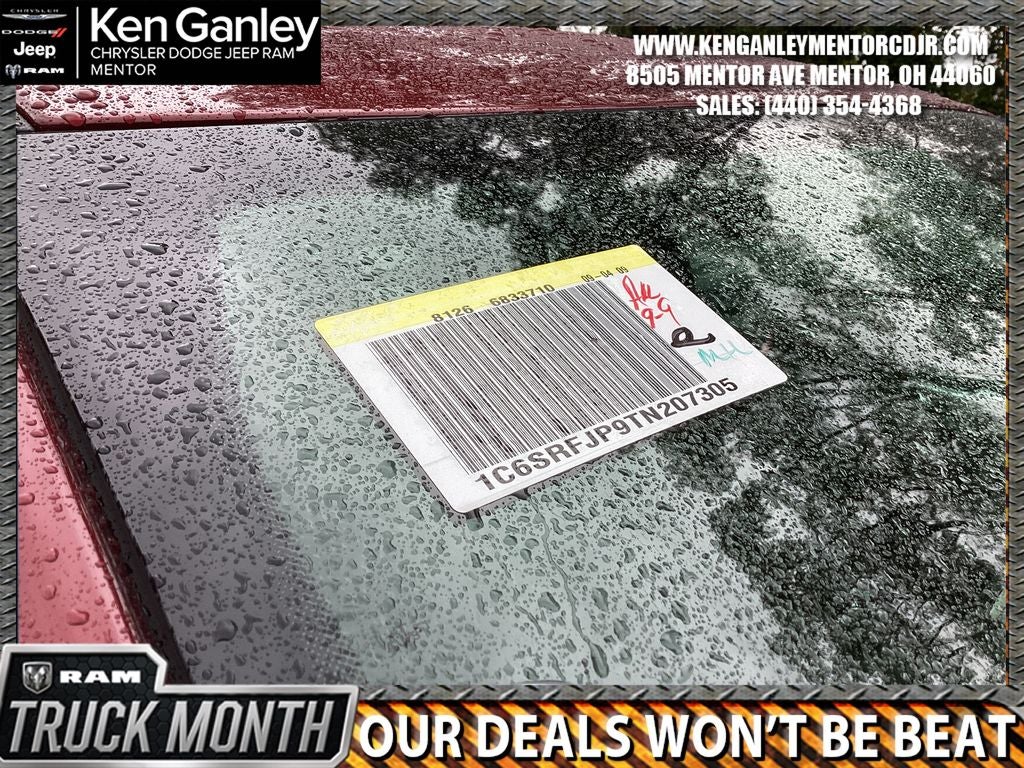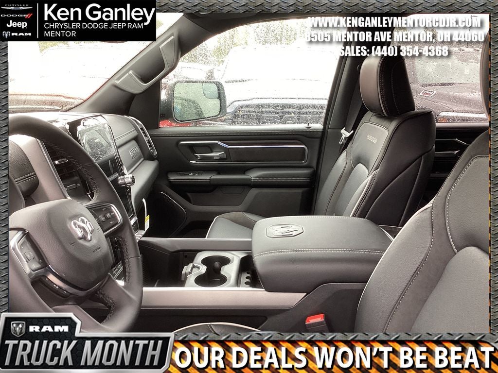 *Heated steering wheel, *ParkView Rear Back-Up Camera, *Ventilated front seats, 10 Speakers, 3.55 Rear Axle Ratio, 4-Wheel Disc Brakes, 4G LTE Wi-Fi Hot Spot, ABS brakes, Accent Color Premium Power Mirrors, Active Noise Control System, Air Conditioning, Alloy wheels, AM/FM radio: SiriusXM with 360L, Apple CarPlay/Android Auto, Audio memory, Auto High-beam Headlights, Auto Power-Folding Mirrors, Auto-dimming door mirrors, Auto-Dimming Exterior Driver Mirror, Auto-dimming Rear-View mirror, Automatic temperature control, Black Interior Accents, Black Painted Exterior Mirrors Caps, Body Color Front Bumper, Body Color Rear Bumper with Step Pads, Brake assist, Bridgestone Brand Tires, Bumpers: chrome, Chrome Exterior Mirrors, Compass, Connected Travel and Traffic Services, Connectivity - US/Canada, Convex Wide-Angle Exterior Mirror Insert, Delay-off headlights, Dome Dual LED Reading Lamp, Driver door bin, Driver vanity mirror, Dual front impact airbags, Dual front side impact airbags, Dual-Pane Panoramic Sunroof, Electronic Stability Control, Exterior Mirrors Courtesy Lamps, Exterior Mirrors with Heating Element, Exterior Mirrors with Memory, Exterior Mirrors with Supplemental Signals, Front anti-roll bar, Front Bucket Seats, Front Center Armrest w/Storage, Front dual zone A/C, Front fog lights, Front License Plate Bracket, Front reading lights, Front wheel independent suspension, Fully automatic headlights, Garage door transmitter, GPS Navigation, Grille Surround 3 Body Color Tex 2 Black, Heated door mirrors, Heated front seats, Heated rear seats, Illuminated entry, Integrated Center Stack Radio, Integrated Voice Command with Bluetooth®, Laramie Level 1 Equipment Group, Leather steering wheel, Leather Trimmed Bucket Seats, LED Dome/Reading Lamp, Low tire pressure warning, Manufacturer's Statement of Origin, Memory seat, MOPAR Front and Rear Rubber Floor Mats, MyFlexCare Service Plan, Navigation System, Occupant sensing airbag, Off-Road Information Pages, Outside temperature display, Overhead airbag, Overhead console, Panic alarm, Passenger door bin, Passenger vanity mirror, Power door mirrors, Power driver seat, Power passenger seat, Power steering, Power windows, Quick Order Package 21H Laramie, Radio data system, Radio: Uconnect 5 Navigation with 12.0 Display, Rain Sensitive Windshield Wipers, RAM Grille Badge - Chrome, Rear anti-roll bar, Rear reading lights, Rear seat center armrest, Rear step bumper, Rear Wheelhouse Liners, Remote keyless entry, Remote Tailgate Release, Security system, SiriusXM Radio Service, SiriusXM with 360L, Speed control, Split folding rear seat, Sport Appearance Package, Sport Performance Hood, Steering wheel mounted audio controls, Tachometer, Telescoping steering wheel, Tilt steering wheel, Traction control, Trailer Brake Control, Trip computer, Turn signal indicator mirrors, USB Host Flip, Variably intermittent wipers, Voltmeter, Wheels: 20 x 9 Premium Paint/Polish. PRICING AVAILABLE TO ALL CUSTOMER!!! WE ARE ONE OF OHIO'S LEADING VOLUME DEALERSHIPS COME SEE OUR HUGE SELECTION AND UNMATCHED SAVINGS ONLY AT GANLEY VILLAGE CHRYSLER DODGE JEEP RAM FIAT OF PAINESVILLE, OH 44077.