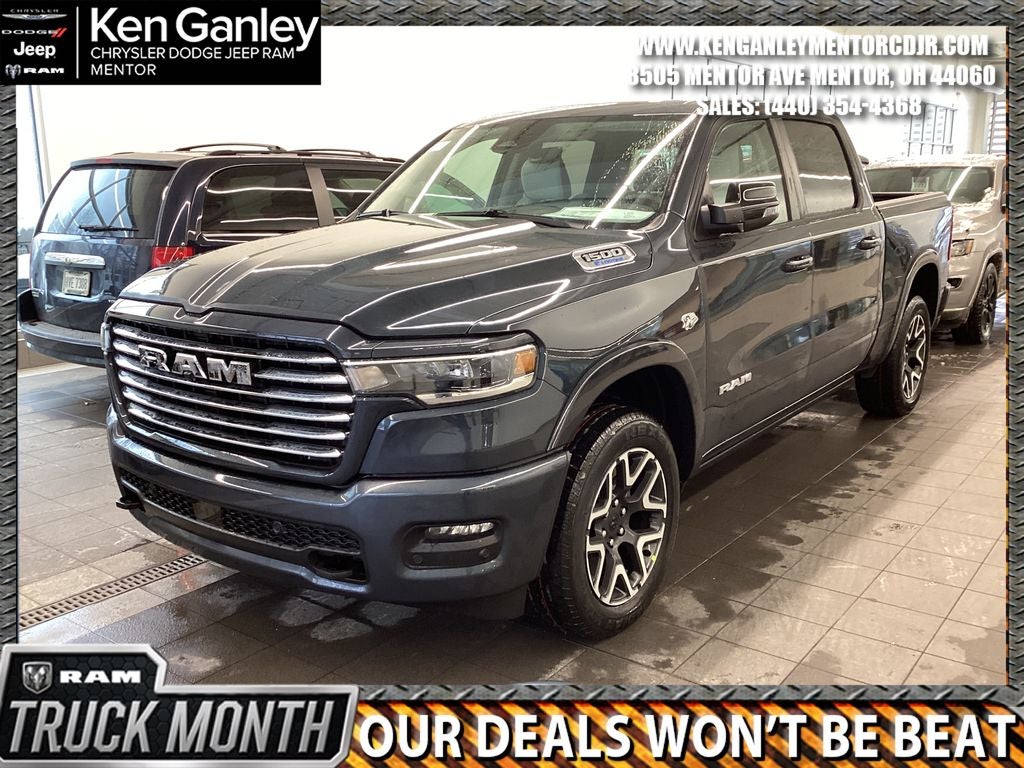 *Heated steering wheel, *ParkView Rear Back-Up Camera, *Ventilated front seats, 10 Speakers, 4-Wheel Disc Brakes, 4G LTE Wi-Fi Hot Spot, ABS brakes, Accent Color Premium Power Mirrors, Active Noise Control System, Adjustable pedals, Air Conditioning, Alloy wheels, AM/FM radio: SiriusXM with 360L, Apple CarPlay/Android Auto, Audio memory, Auto High-beam Headlights, Auto Power-Folding Mirrors, Auto-dimming door mirrors, Auto-Dimming Exterior Driver Mirror, Auto-dimming Rear-View mirror, Automatic temperature control, Black Painted Exterior Mirrors Caps, Body Color Front Bumper, Body Color Rear Bumper with Step Pads, Brake assist, Bumpers: chrome, Chrome Exterior Mirrors, Compass, Connected Travel and Traffic Services, Connectivity - US/Canada, Convex Wide-Angle Exterior Mirror Insert, Delay-off headlights, Dome Dual LED Reading Lamp, Driver door bin, Driver vanity mirror, Dual front impact airbags, Dual front side impact airbags, Dual-Pane Panoramic Sunroof, Electronic Stability Control, Exterior Mirrors Courtesy Lamps, Exterior Mirrors with Heating Element, Exterior Mirrors with Memory, Exterior Mirrors with Supplemental Signals, Front anti-roll bar, Front Bucket Seats, Front Center Armrest w/Storage, Front dual zone A/C, Front fog lights, Front License Plate Bracket, Front reading lights, Front wheel independent suspension, Fully automatic headlights, Garage door transmitter, GPS Navigation, Grille Surround 3 Body Color Tex 4 Chrome, Heated door mirrors, Heated front seats, Heated rear seats, Illuminated entry, Integrated Center Stack Radio, Integrated Voice Command with Bluetooth®, Laramie Level 1 Equipment Group, Laramie Preferred Package, Leather steering wheel, Leather Trimmed Bucket Seats, LED Dome/Reading Lamp, Low tire pressure warning, Manufacturer's Statement of Origin, Memory seat, MOPAR Front and Rear Rubber Floor Mats, MyFlexCare Service Plan, Navigation System, Occupant sensing airbag, Off-Road Information Pages, Outside temperature display, Overhead airbag, Overhead console, Panic alarm, Passenger door bin, Passenger vanity mirror, Pedal memory, Power Deployable Running Boards, Power door mirrors, Power driver seat, Power passenger seat, Power steering, Power windows, Quick Order Package 27H Laramie, Radio data system, Radio: Uconnect 5 Navigation with 12.0 Display, Rain Sensitive Windshield Wipers, RAM Grille Badge - Chrome, Rear anti-roll bar, Rear reading lights, Rear seat center armrest, Rear step bumper, Rear Wheelhouse Liners, Remote keyless entry, Remote Tailgate Release, Security system, SiriusXM Radio Service, SiriusXM with 360L, Speed control, Split folding rear seat, Steering wheel mounted audio controls, Tachometer, Telescoping steering wheel, Tilt steering wheel, Tow Hooks, Traction control, Trailer Brake Control, Trip computer, Turn signal indicator mirrors, USB Host Flip, Variably intermittent wipers, Voltmeter, Wheels: 20 x 9 Premium Paint/Polish. PRICING AVAILABLE TO ALL CUSTOMER!!! WE ARE ONE OF OHIO'S LEADING VOLUME DEALERSHIPS COME SEE OUR HUGE SELECTION AND UNMATCHED SAVINGS ONLY AT GANLEY VILLAGE CHRYSLER DODGE JEEP RAM FIAT OF PAINESVILLE, OH 44077.