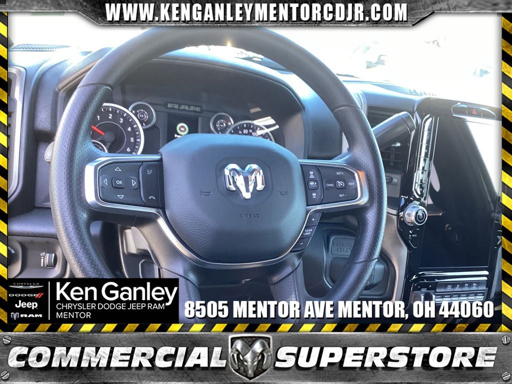 *ParkView Rear Back-Up Camera, 115-Volt Auxiliary Front Power Outlet, 12 Touchscreen Display, 2 Way Rear Headrest Seat, 4 Way Front Headrests, 4-Wheel Disc Brakes, 40/20/40 Split Bench Seat, 400W Inverter, 4G LTE Wi-Fi Hot Spot, 6 Speakers, ABS brakes, Add Vinyl Seat, Air Conditioning, Air Conditioning ATC with Dual Zone Control, Alexa Built-in, AM/FM radio: SiriusXM, Anti-Spin Differential Rear Axle, Apple CarPlay, Apple CarPlay/Android Auto, Auto-Dimming Rear-View Mirror, Bed Utility Group, Black Exterior Mirrors, Black Wheel Center Hub, Brake assist, Bright Front Bumper, Bright Rear Bumper, Carpet Floor Covering, Center Hub, Chrome Grille Surround, Clearance Lamps, Cloth 40/20/40 Bench Seat, Commercial Features Package, Compass, Connected Travel and Traffic Services, Connectivity - US/Canada, Dash Pass Thru Wire Circuits, Delay-off headlights, Disassociated Touchscreen Display, Driver door bin, Dual Alternators Rated At 400 Amps, Dual front impact airbags, Dual front side impact airbags, Electronic Stability Control, Emergency Vehicle Alert System (EVAS), Exterior 115V AC Outlet, Exterior Mirrors Courtesy Lamps, Exterior Mirrors with Heating Element, Exterior Mirrors with Supplemental Signals, For Details, Visit DriveUconnect.com, For More Info, Call 800-643-2112, Front and Rear Floor Mats, Front anti-roll bar, Front Armrest with Cupholders, Front Center Armrest w/Storage, Front fog lights, Front License Plate Bracket, Front reading lights, Fully automatic headlights, Global Telematics Box Module, Google Android Auto, GPS Antenna Input, GPS Navigation, HD Radio, Illuminated entry, Instrument Panel Mounted Auxiliary Switches, Integrated Voice Command with Bluetooth®, LED Bed Lighting, Low tire pressure warning, Manual Adjust 4-Way Driver Seat, Manual Adjust 4-Way Front Passenger Seat, Manual Folding Exterior Mirrors, Manual Telescoping Mirrors, Manufacturer's Statement of Origin, Matte Black Mesh Grille with Chrome, Mirror Running Lights, Mopar Black Tubular Side Steps, MOPAR Deployable Bed Step, MOPAR Front and Rear Rubber Floor Mats, MOPAR Spray in Bedliner, MyFlexCare Service Plan, Occupant sensing airbag, Off-Road Info Pages, Outside temperature display, Overhead airbag, Overhead console, Panic alarm, ParkSense Front/Rear Park Assist System, Passenger door bin, Passenger vanity mirror, Power Adjust Mirrors, Power Heated Folding Telescope Mirrors, Power steering, Power windows, Power-Adjustable Convex Aux Mirrors, Quick Order Package 2UA Tradesman, Radio data system, Radio: Uconnect 5 Navigation with 12.0 Display, Radio: Uconnect 5 with 8.4 Display, Rear anti-roll bar, Rear Folding Seat, Rear Power Sliding Window, Rear step bumper, Rear Wheelhouse Liners, Rear window defroster, Remote keyless entry, Remote USB Port - Charge Only, Selectable Tire Fill Alert, SiriusXM Radio Service, SiriusXM with 360L, Speed control, Storage Tray, Tachometer, Tilt steering wheel, Tinted Acoustic Windshield Glass, Traction control, Tradesman Level 2 Equipment Group, Trailer Tow Pages, Variably intermittent wipers, Voltmeter, Wheels: 17 x 7.5 Black Steel Styled, Wheels: 18 x 8.0 Steel Chrome Clad. PRICING AVAILABLE TO ALL CUSTOMER!!! WE ARE ONE OF OHIO'S LEADING VOLUME DEALERSHIPS COME SEE OUR HUGE SELECTION AND UNMATCHED SAVINGS ONLY AT GANLEY VILLAGE CHRYSLER DODGE JEEP RAM FIAT OF PAINESVILLE, OH 44077.