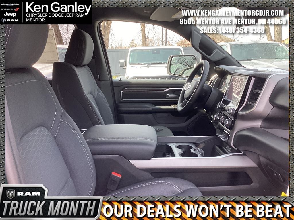 *ParkView Rear Back-Up Camera, 3 Rear Seat Head Restraints, 3.21 Rear Axle Ratio, 4 Way Front Headrests, 4-Wheel Disc Brakes, 48V Belt Starter Generator, 4G LTE Wi-Fi Hot Spot, 6 Speakers, ABS brakes, Air Conditioning, Alloy wheels, AM/FM radio, Apple CarPlay, Apple CarPlay/Android Auto, Auto High-beam Headlights, Black Exterior Mirrors, Brake assist, Bucket Seats, Bumpers: chrome, Center Console Parts Module, Cloth Bucket Seats, Compass, Connectivity - US/Canada, Convex Wide-Angle Exterior Mirror Insert, Delay-off headlights, Driver door bin, Dual front impact airbags, Dual front side impact airbags, Electronic Stability Control, Exterior Mirrors with Heating Element, Front anti-roll bar, Front Bucket Seats, Front Center Armrest w/Storage, Front fog lights, Front License Plate Bracket, Front reading lights, Front wheel independent suspension, Full Length Floor Console, Fully automatic headlights, Global Telematics Box Module, Google Android Auto, GPS Antenna Input, Heated door mirrors, Illuminated entry, Integrated Center Stack Radio, Integrated Voice Command with Bluetooth®, Low tire pressure warning, Manual Adjust 4-Way Driver Seat, Manual Adjust 4-Way Front Passenger Seat, Manual Folding Exterior Mirrors, Manufacturer's Statement of Origin, MOPAR Front and Rear Rubber Floor Mats, MyFlexCare Service Plan, Occupant sensing airbag, Outside temperature display, Overhead airbag, Overhead console, Panic alarm, Passenger door bin, Passenger vanity mirror, Power door mirrors, Power steering, Power windows, Quick Order Package 23Z Big Horn, Radio data system, Radio: Uconnect 5 W with 8.4 Display, RAM Grille Badge - Chrome, Rear anti-roll bar, Rear step bumper, Remote keyless entry, Speed control, Supplier Part Tracking (J-1), Tachometer, Telescoping steering wheel, Tilt steering wheel, Traction control, Trip computer, USB Host Flip, Variably intermittent wipers, Voltmeter, Wheels: 18 x 8 Cast-Aluminum Painted. PRICING AVAILABLE TO ALL CUSTOMER!!! WE ARE ONE OF OHIO'S LEADING VOLUME DEALERSHIPS COME SEE OUR HUGE SELECTION AND UNMATCHED SAVINGS ONLY AT GANLEY VILLAGE CHRYSLER DODGE JEEP RAM FIAT OF PAINESVILLE, OH 44077.