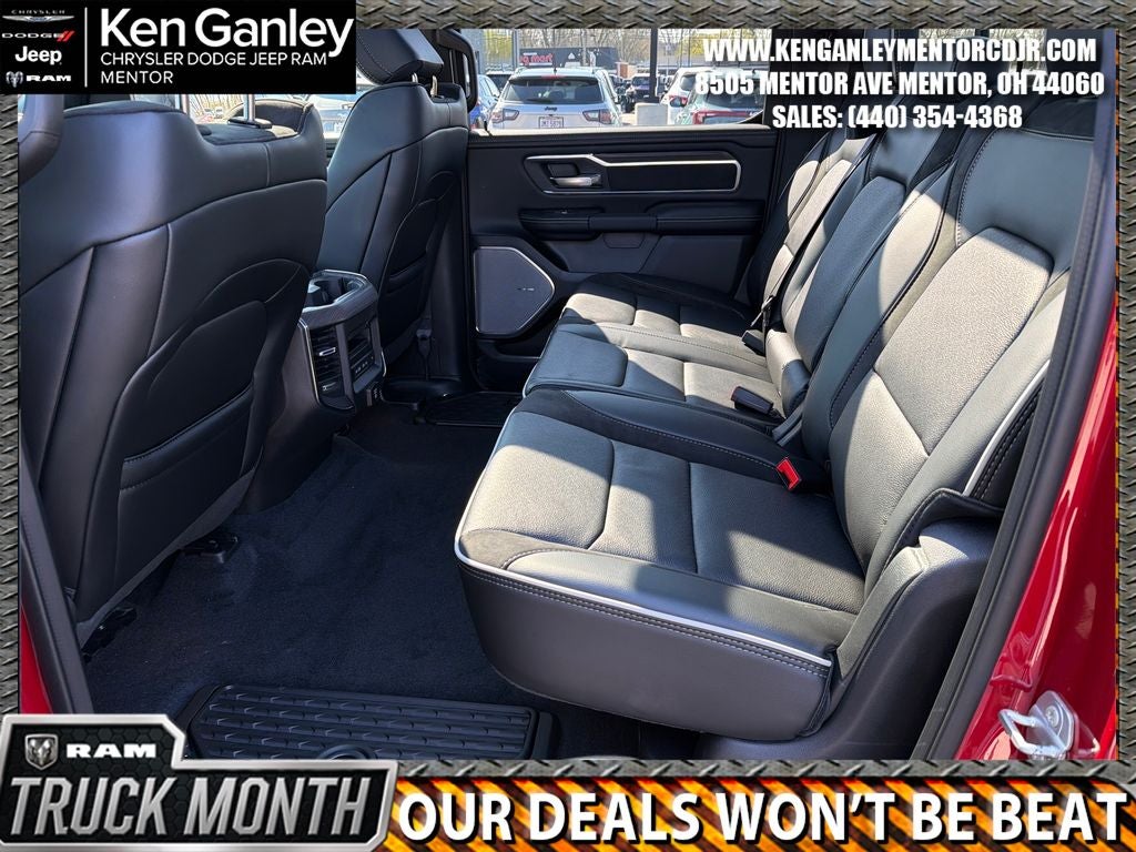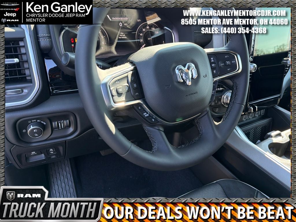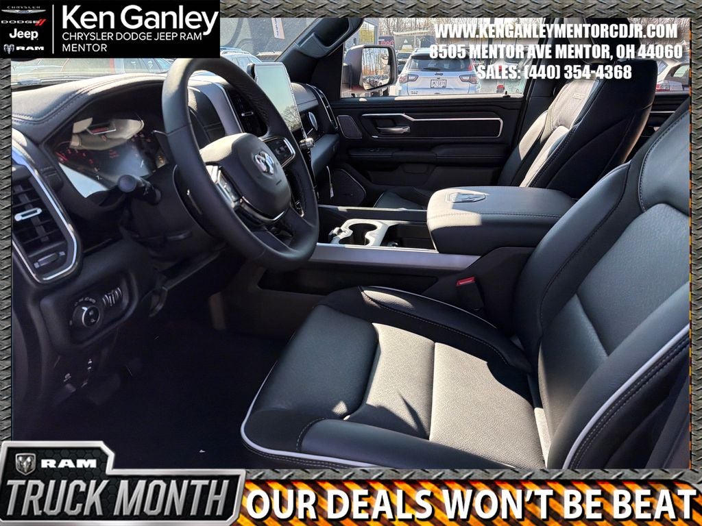 *Heated steering wheel, *ParkView Rear Back-Up Camera, *Ventilated front seats, 10 Speakers, 14.4 Touchscreen Display, 4-Wheel Disc Brakes, 4G LTE Wi-Fi Hot Spot, ABS brakes, Accent Color Door Handles, Accent Color Premium Power Mirrors, Accent Color Tailgate Handle, Active Noise Control System, Adjustable pedals, Air Conditioning, Alloy wheels, AM/FM radio: SiriusXM with 360L, Anti-Spin Differential Rear Axle, Apple CarPlay/Android Auto, Audio memory, Auto High-beam Headlights, Auto Power-Folding Mirrors, Auto-dimming door mirrors, Auto-Dimming Exterior Driver Mirror, Auto-dimming Rear-View mirror, Automatic temperature control, Bed Utility Group, Black Exterior Truck Badging, Black Headlamp Bezels, Black Interior Accents, Black Painted Exterior Mirrors Caps, Black Tail Lamp Bezels, Body Color Front Bumper, Body Color Rear Bumper with Step Pads, Brake assist, Bumpers: chrome, Chrome Exterior Mirrors, Cluster 12 TFT Color Display, Compass, Connected Travel and Traffic Services, Connectivity - US/Canada, Convex Wide-Angle Exterior Mirror Insert, Delay-off headlights, Dome Dual LED Reading Lamp, Driver door bin, Driver vanity mirror, Dual Exhaust with Black Tips, Dual front impact airbags, Dual front side impact airbags, Dual-Pane Panoramic Sunroof, Electronic Stability Control, Exterior 115V AC Outlet, Exterior Mirrors Approach Lamps, Exterior Mirrors Courtesy Lamps, Exterior Mirrors with Heating Element, Exterior Mirrors with Memory, Exterior Mirrors with Supplemental Signals, Front anti-roll bar, Front Bucket Seats, Front Center Armrest w/Storage, Front dual zone A/C, Front fog lights, Front License Plate Bracket, Front Passenger Interactive Display, Front reading lights, Front wheel independent suspension, Fully automatic headlights, Garage door transmitter, GPS Navigation, Grille Surround 3 Black Texture 2 Black, Harman/Kardon 19 Speaker Premium Sound, Heated door mirrors, Heated front seats, Heated rear seats, Illuminated entry, Integrated Center Stack Radio, Integrated Voice Command with Bluetooth®, Laramie Level 2 Equipment Group, Leather steering wheel, Leather Trimmed Bucket Seats, LED Dome/Reading Lamp, Low tire pressure warning, Manufacturer's Statement of Origin, Memory seat, MOPAR 4 Adjustable Cargo Tie-Down Hooks, MOPAR Front and Rear Rubber Floor Mats, MOPAR Spray in Bedliner, MyFlexCare Service Plan, Navigation System, Night Edition, Occupant sensing airbag, Off-Road Information Pages, Outside temperature display, Overhead airbag, Overhead console, Panic alarm, Passenger door bin, Passenger vanity mirror, Pedal memory, Pirelli Brand Tires, Power Deployable Running Boards, Power door mirrors, Power driver seat, Power passenger seat, Power steering, Power Tailgate, Power windows, Proximity Approach/Departure Lamps, Quick Order Package 27H Laramie, Radio data system, Radio: Uconnect 5 Nav with 14.4 Display, Radio: Uconnect 5 Navigation with 12.0 Display, Rain Sensitive Windshield Wipers, RAM Grille Badge - Black, RAM Grille Badge - Chrome, Rear anti-roll bar, Rear reading lights, Rear seat center armrest, Rear step bumper, Rear Wheelhouse Liners, Remote keyless entry, Security system, SiriusXM Radio Service, SiriusXM with 360L, Speed control, Split folding rear seat, Sport Performance Hood, Steering wheel mounted audio controls, Tachometer, Telescoping steering wheel, Tilt steering wheel, Traction control, Trailer Brake Control, Trip computer, Turn signal indicator mirrors, USB Host Flip, Variably intermittent wipers, Voltmeter, Wheels: 20 x 9 Premium Paint/Polish, Wheels: 22 x 9 Forged Aluminum. PRICING AVAILABLE TO ALL CUSTOMER!!! WE ARE ONE OF OHIO'S LEADING VOLUME DEALERSHIPS COME SEE OUR HUGE SELECTION AND UNMATCHED SAVINGS ONLY AT GANLEY VILLAGE CHRYSLER DODGE JEEP RAM FIAT OF PAINESVILLE, OH 44077.