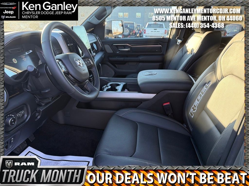 *Heated Second Row Seats, *Heated steering wheel, *ParkView Rear Back-Up Camera, 10 Speakers, 115V Auxiliary Rear Power Outlet, 14.4 Touchscreen Display, 2-Door Passive Entry, Front Door Locks, 3.92 Rear Axle Ratio, 4 Way Front Headrests, 4-Wheel Disc Brakes, 4G LTE Wi-Fi Hot Spot, ABS brakes, Accent Color Door Handles, Accent Color Premium Power Mirrors, Accent Color Tailgate Handle, Active Noise Control System, Air Conditioning, Alloy wheels, AM/FM radio: SiriusXM with 360L, Apple CarPlay, Apple CarPlay/Android Auto, Auto High-beam Headlights, Auto Power-Folding Mirrors, Auto-Dimming Exterior Driver Mirror, Auto-dimming Rear-View mirror, Automatic temperature control, Bed Utility Group, Black Exterior Mirrors, Black Painted Exterior Mirrors Caps, Brake assist, Bucket Seats, Cloth/Vinyl Bucket Seats, Compass, Connected Travel and Traffic Services, Connectivity - US/Canada, Convex Wide-Angle Exterior Mirror Insert, Delay-off headlights, Disassociated Touchscreen Display, Dome Dual LED Reading Lamp, Driver door bin, Driver Seat Memory, Driver vanity mirror, Dual front impact airbags, Dual front side impact airbags, Dual Wireless Charging Pad, Dual-Pane Panoramic Sunroof, Electronic Stability Control, Exterior 115V AC Outlet, Exterior Mirrors Approach Lamps, Exterior Mirrors Courtesy Lamps, Exterior Mirrors with Heating Element, Exterior Mirrors with Memory, Exterior Mirrors with Supplemental Signals, Front anti-roll bar, Front Bucket Seats, Front Center Armrest w/Storage, Front dual zone A/C, Front fog lights, Front License Plate Bracket, Front Passenger Interactive Display, Front reading lights, Front Seat Back Map Pockets, Front wheel independent suspension, Full Length Upgraded Floor Console, Fully automatic headlights, Garage door transmitter, Global Telematics Box Module, Google Android Auto, GPS Antenna Input, GPS Navigation, Harman/Kardon 19 Speaker Premium Sound, HD Radio, Heated door mirrors, Heated Front Seats, Heated front seats, Heated Steering Wheel, Illuminated entry, Integrated Center Stack Radio, Integrated Voice Command with Bluetooth®, Leather steering wheel, Low tire pressure warning, Manual Folding Exterior Mirrors, Manufacturer's Statement of Origin, Media Hub with 2 Charge Only USBs, MOPAR 4 Adjustable Cargo Tie-Down Hooks, MOPAR Spray in Bedliner, MyFlexCare Service Plan, Navigation System, Occupant sensing airbag, Off-Road Information Pages, Outside temperature display, Overhead airbag, Overhead console, Panic alarm, Passenger door bin, Passenger vanity mirror, Power 2-Way Driver Lumbar Adjust, Power 2-Way Passenger Lumbar Adjust, Power Adjust 8-Way Driver Seat, Power Adjust 8-Way Front Passenger Seat, Power Adjustable Pedals with Memory, Power door mirrors, Power driver seat, Power steering, Power Tailgate, Power windows, Proximity Approach/Departure Lamps, Quick Order Package 21W Rebel, Radio data system, Radio: Uconnect 5 Nav with 14.4 Display, Radio: Uconnect 5 Navigation with 12.0 Display, Radio/Driver Seat/Mirrors/Pedals Memory, Rain Sensitive Windshield Wipers, Rear 60/40 Folding Seat, Rear anti-roll bar, Rear seat center armrest, Rear step bumper, Rear Wheelhouse Liners, Rear Window Defroster, Rebel Level 2 Equipment Group, Remote keyless entry, Security Alarm, SiriusXM Radio Service, SiriusXM with 360L, Smartphone as a Key Capable, Speed control, Split folding rear seat, Steering wheel mounted audio controls, Tachometer, Telescoping steering wheel, Tilt steering wheel, Traction control, Trailer Brake Control, Trip computer, USB Host Flip, Variably intermittent wipers, Voltmeter, Wheels: 18 x 8.0 Painted Mid-Gloss Black. PRICING AVAILABLE TO ALL CUSTOMER!!! WE ARE ONE OF OHIO'S LEADING VOLUME DEALERSHIPS COME SEE OUR HUGE SELECTION AND UNMATCHED SAVINGS ONLY AT GANLEY VILLAGE CHRYSLER DODGE JEEP RAM FIAT OF PAINESVILLE, OH 44077.