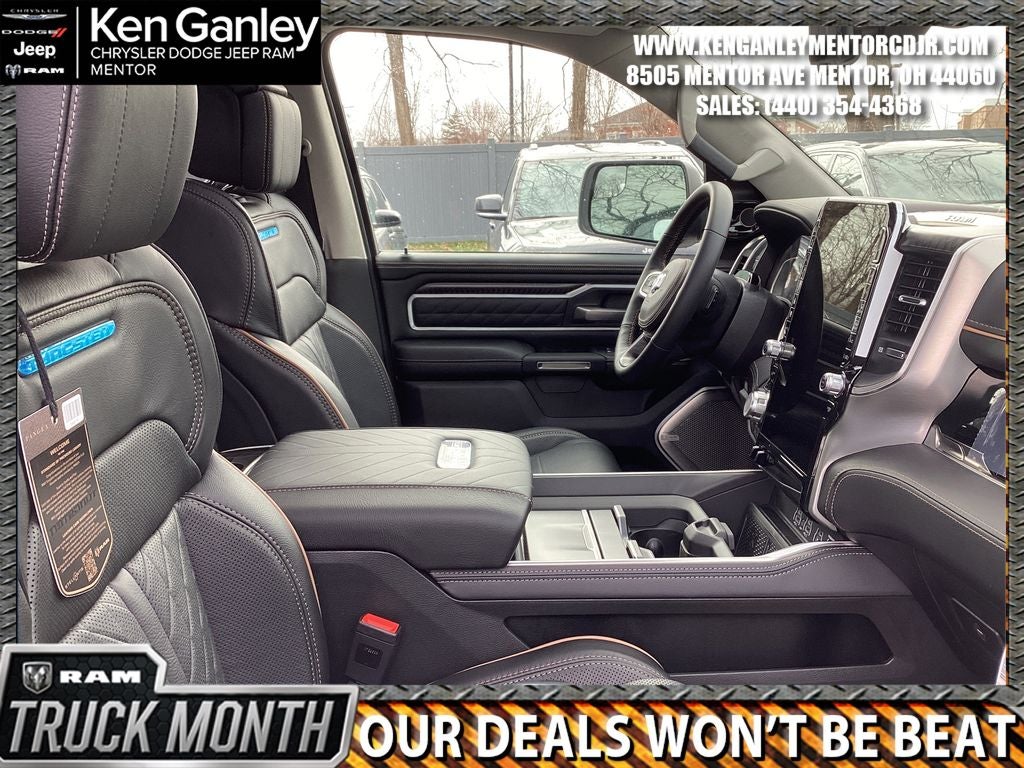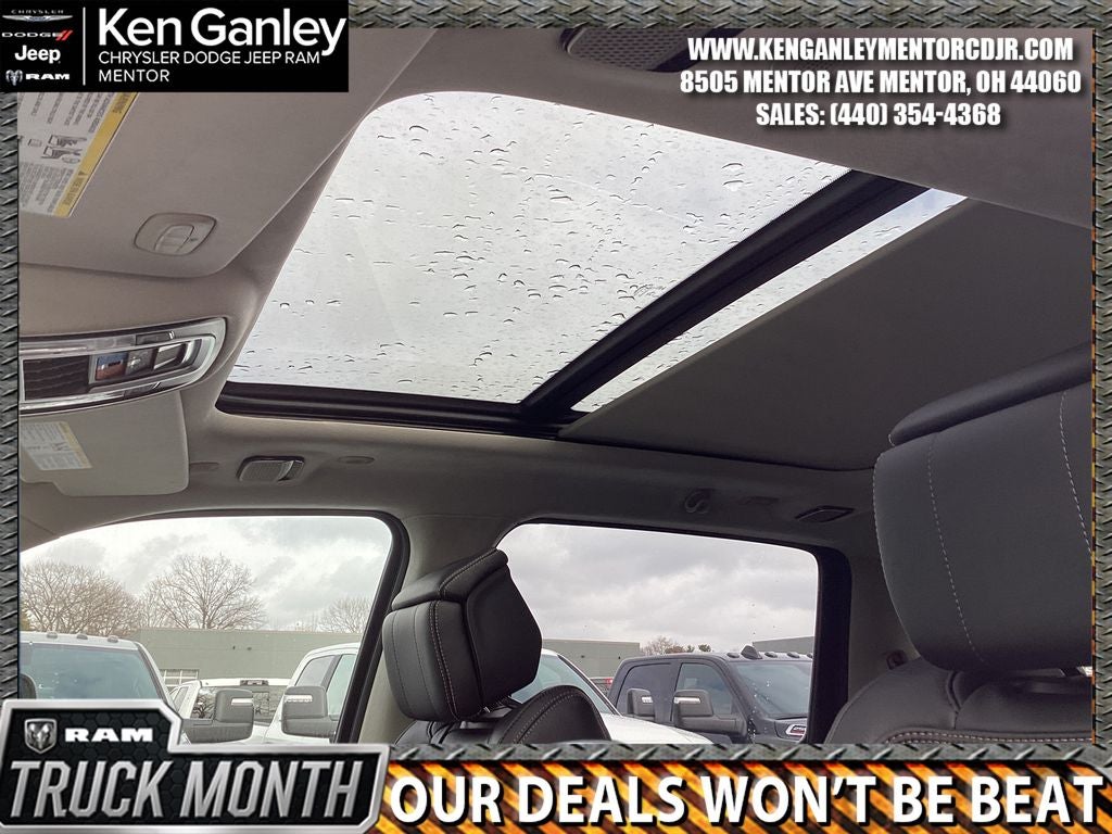 *Heated steering wheel, *Power moonroof, *Ventilated front seats, 12-Way/1-Way Trailer Connector, 3.92 Rear Axle Ratio, 4-Wheel Disc Brakes, ABS brakes, Adjustable pedals, Air Conditioning, Alloy wheels, AM/FM radio, Apple CarPlay/Android Auto, Audio memory, Auto High-beam Headlights, Auto Power-Folding Mirrors, Auto-dimming door mirrors, Auto-Dimming Exterior Driver Mirror, Auto-dimming Rear-View mirror, Auto-leveling suspension, Automatic temperature control, Bodyside moldings, Brake assist, Bumpers: body-color, Chrome Exterior Mirrors, Compass, Delay-off headlights, Driver door bin, Driver vanity mirror, Dual front impact airbags, Dual front side impact airbags, E-Locker Rear Axle, Electronic Stability Control, Exterior Mirrors Courtesy Lamps, Exterior Mirrors with Heating Element, Exterior Mirrors with Memory, Exterior Mirrors with Supplemental Signals, Exterior Parking Camera Rear, Falken Brand Tires, Front anti-roll bar, Front Bucket Seats, Front Center Armrest w/Storage, Front dual zone A/C, Front Extra Heavy Duty Shock Absorbers, Front fog lights, Front License Plate Bracket, Front reading lights, Front wheel independent suspension, Fully automatic headlights, Garage door transmitter, Heads-Up Display, Heated door mirrors, Heated front seats, Heated rear seats, Illuminated entry, Leather steering wheel, Low tire pressure warning, Manufacturer's Statement of Origin, Memory seat, Navigation System, Occupant sensing airbag, Off Road Decals, Off Road Group, Outside temperature display, Overhead airbag, Overhead console, Panic alarm, Passenger door bin, Passenger vanity mirror, Pedal memory, Power adjustable front head restraints, Power door mirrors, Power driver seat, Power passenger seat, Power steering, Power windows, Premium Leather Bucket Seats, Quick Order Package 22V Tungsten, Radio data system, Radio: Uconnect 5 Nav with 14.4 Display, Rain sensing wipers, Raised Ride Height, Rear anti-roll bar, Rear Extra Heavy Duty Shock Absorbers, Rear reading lights, Rear seat center armrest, Rear step bumper, Rear window defroster, Remote keyless entry, Security system, Selec-Speed Control, Speed control, Split folding rear seat, Steering wheel mounted audio controls, Tachometer, Telescoping steering wheel, Tilt steering wheel, Traction control, Trailer Brake Control, Trip computer, Turn signal indicator mirrors, Variably intermittent wipers, Ventilated rear seats, Voltmeter, Wheels: 22 x 9 Polish/Painted with Inserts. PRICING AVAILABLE TO ALL CUSTOMER!!! WE ARE ONE OF OHIO'S LEADING VOLUME DEALERSHIPS COME SEE OUR HUGE SELECTION AND UNMATCHED SAVINGS ONLY AT GANLEY VILLAGE CHRYSLER DODGE JEEP RAM FIAT OF PAINESVILLE, OH 44077.